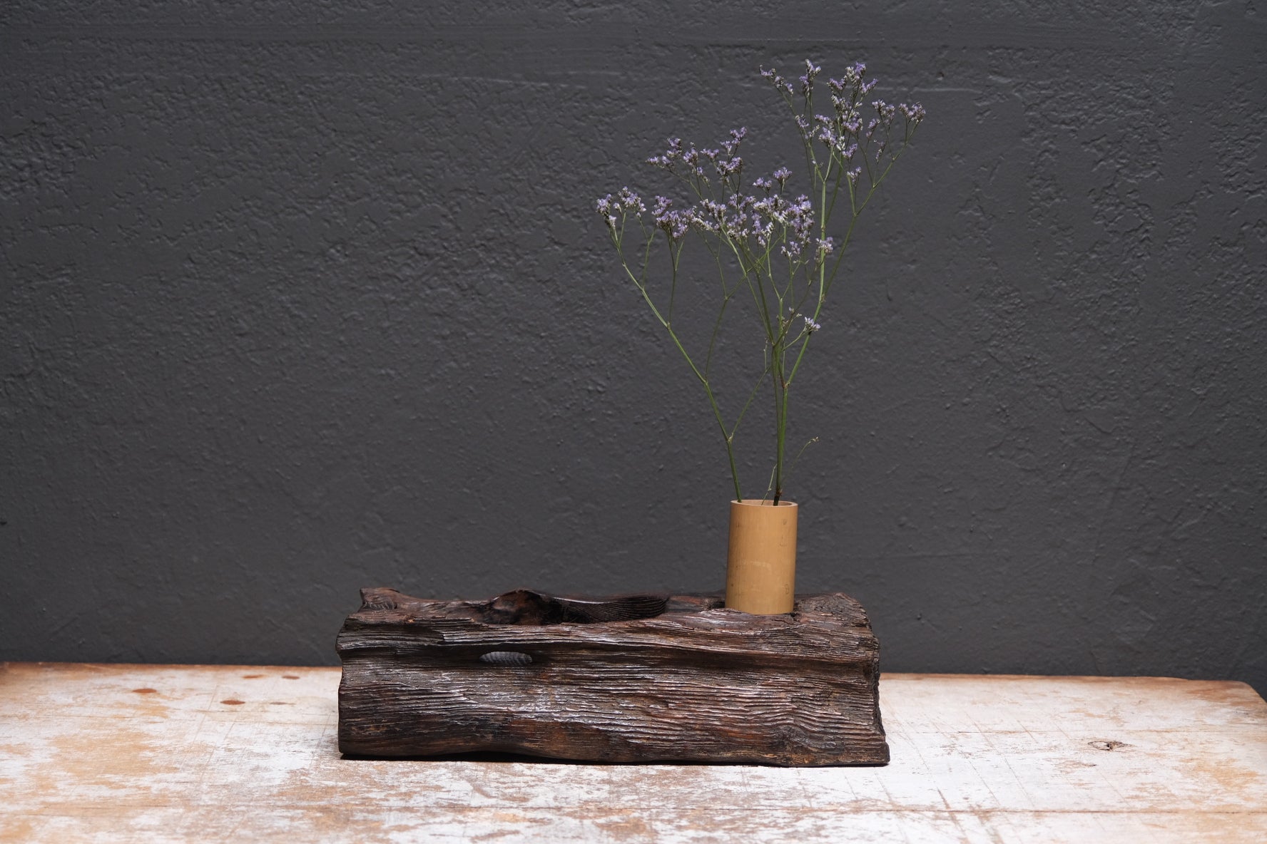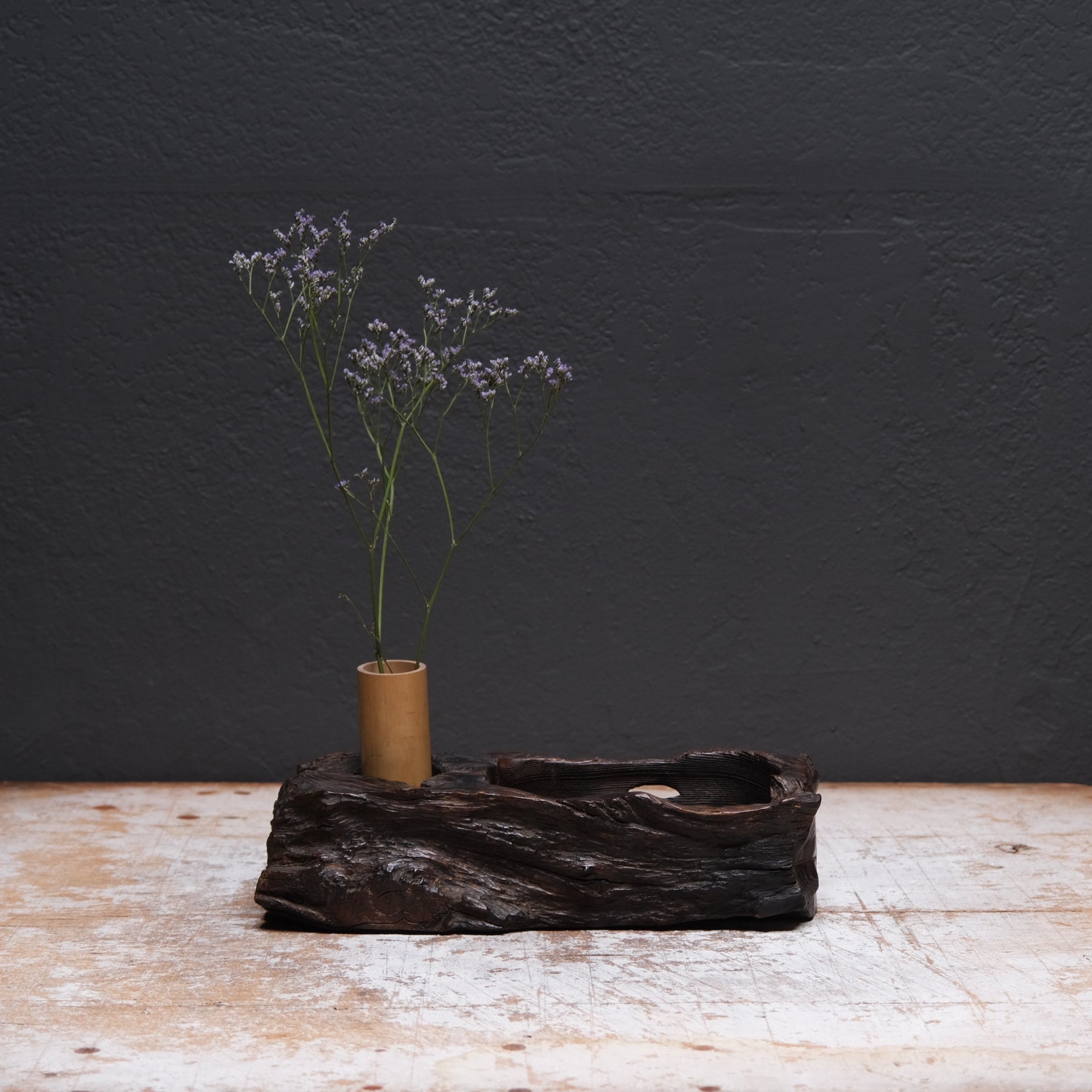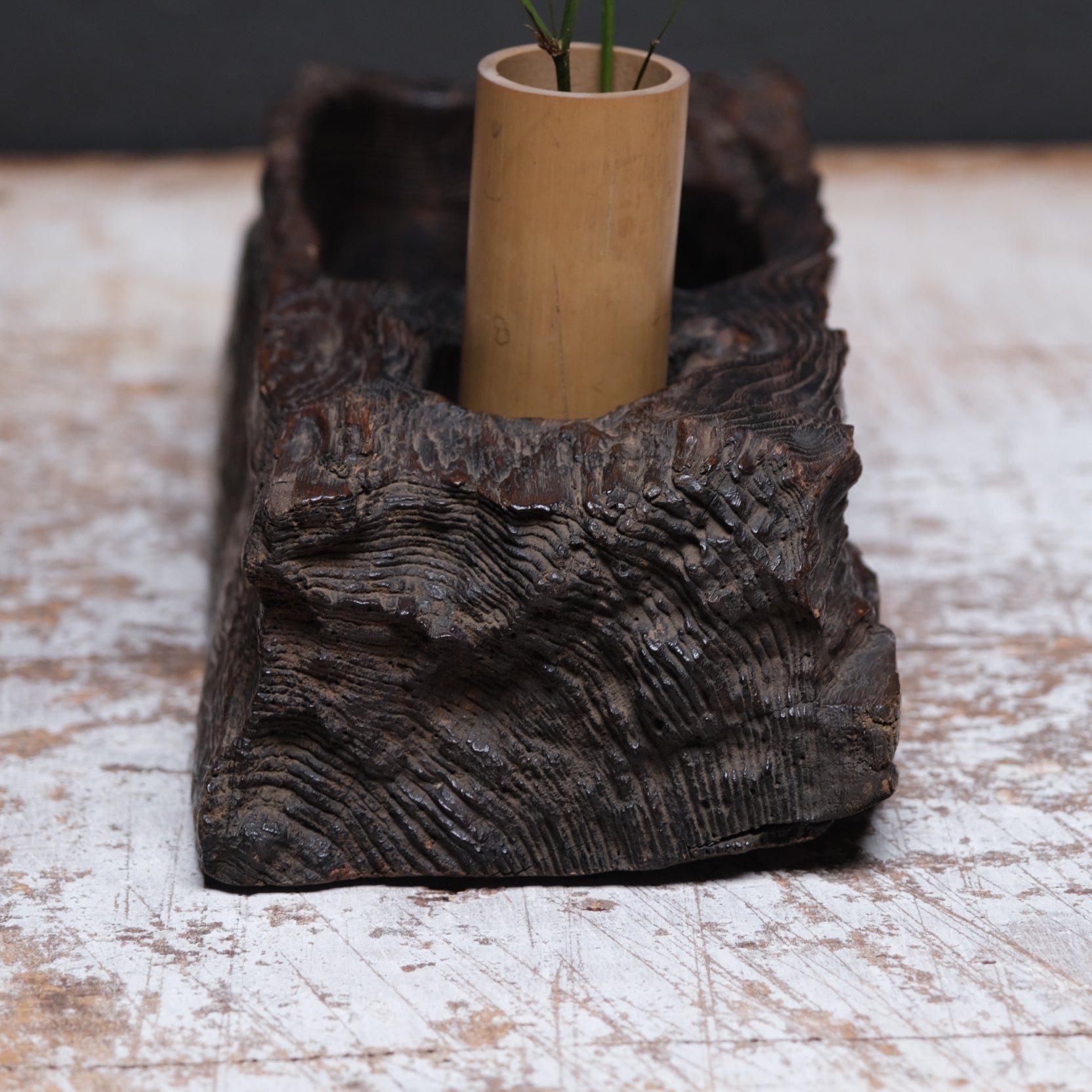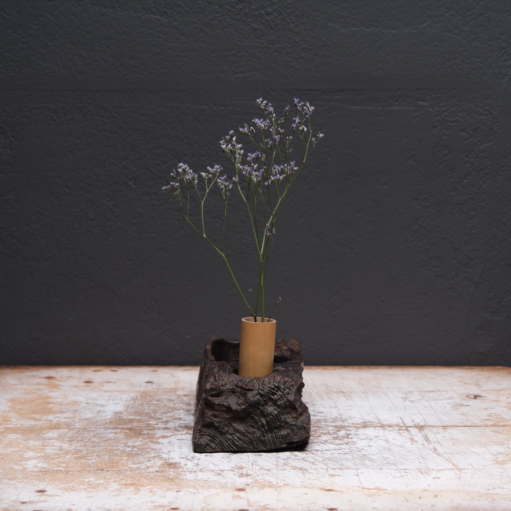 Wooden tobacco tray converted to flower vase with bamboo insert.