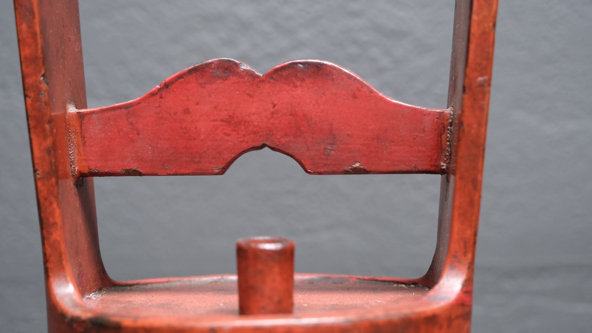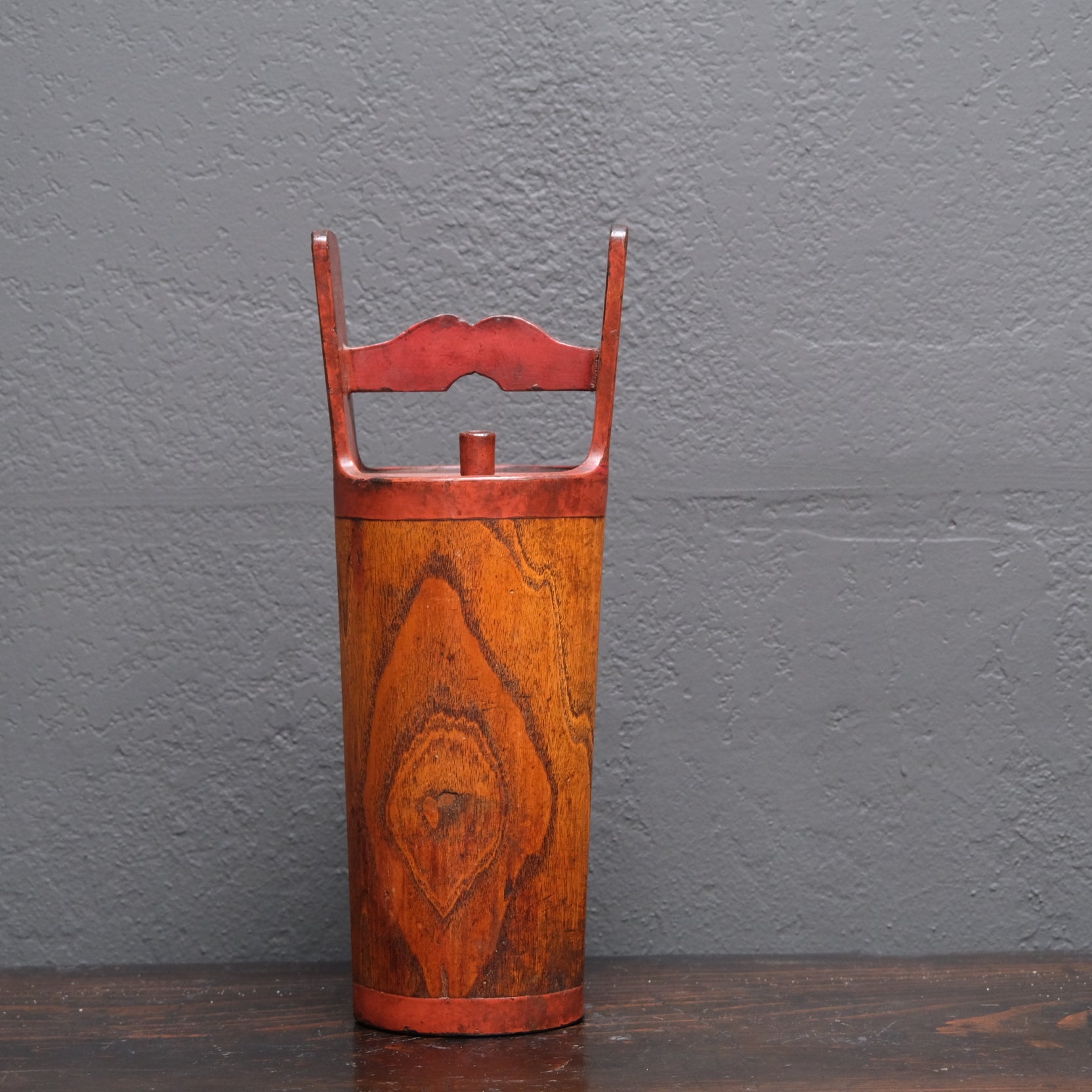 Ceremonial Sake container made of a single piece of lacquered keyaki wood (Japanese elm wood) in the form of a bamboo bucket with handle lacquered with negoro, a traditional red lacquer.