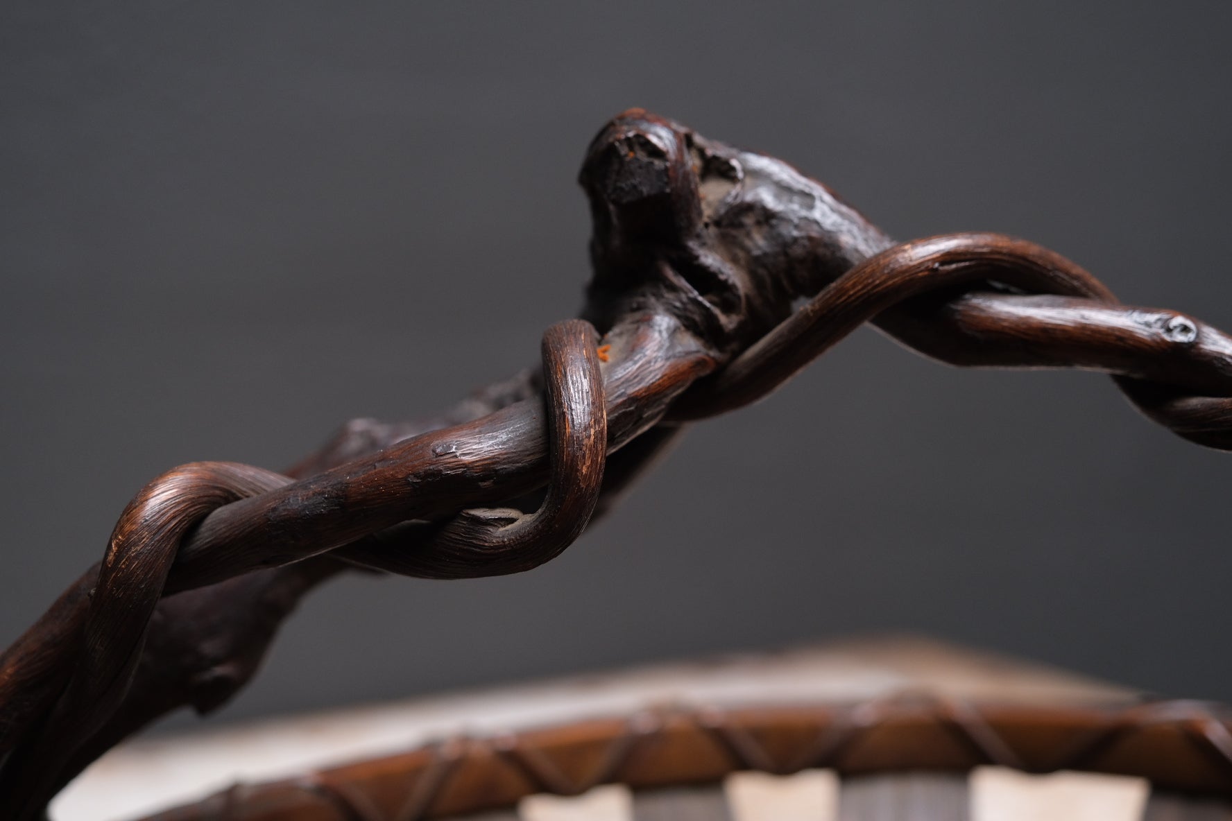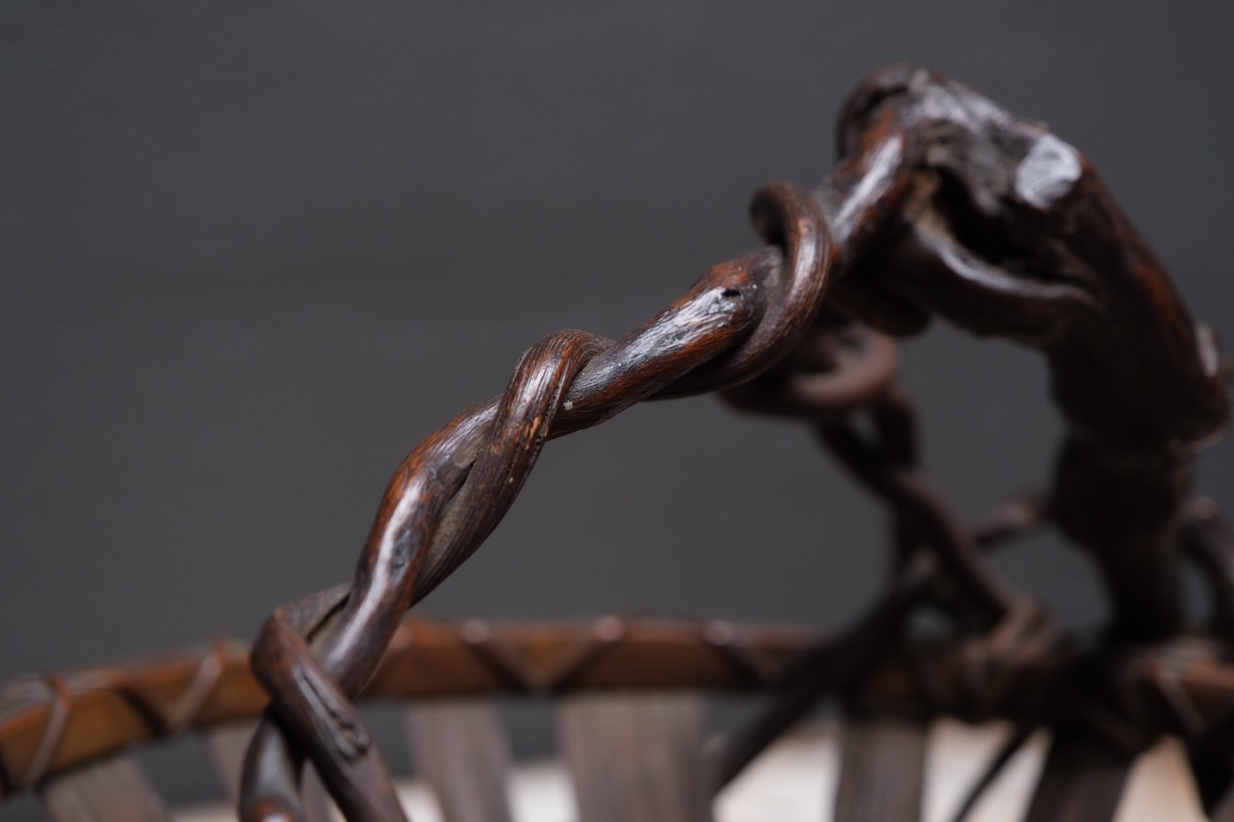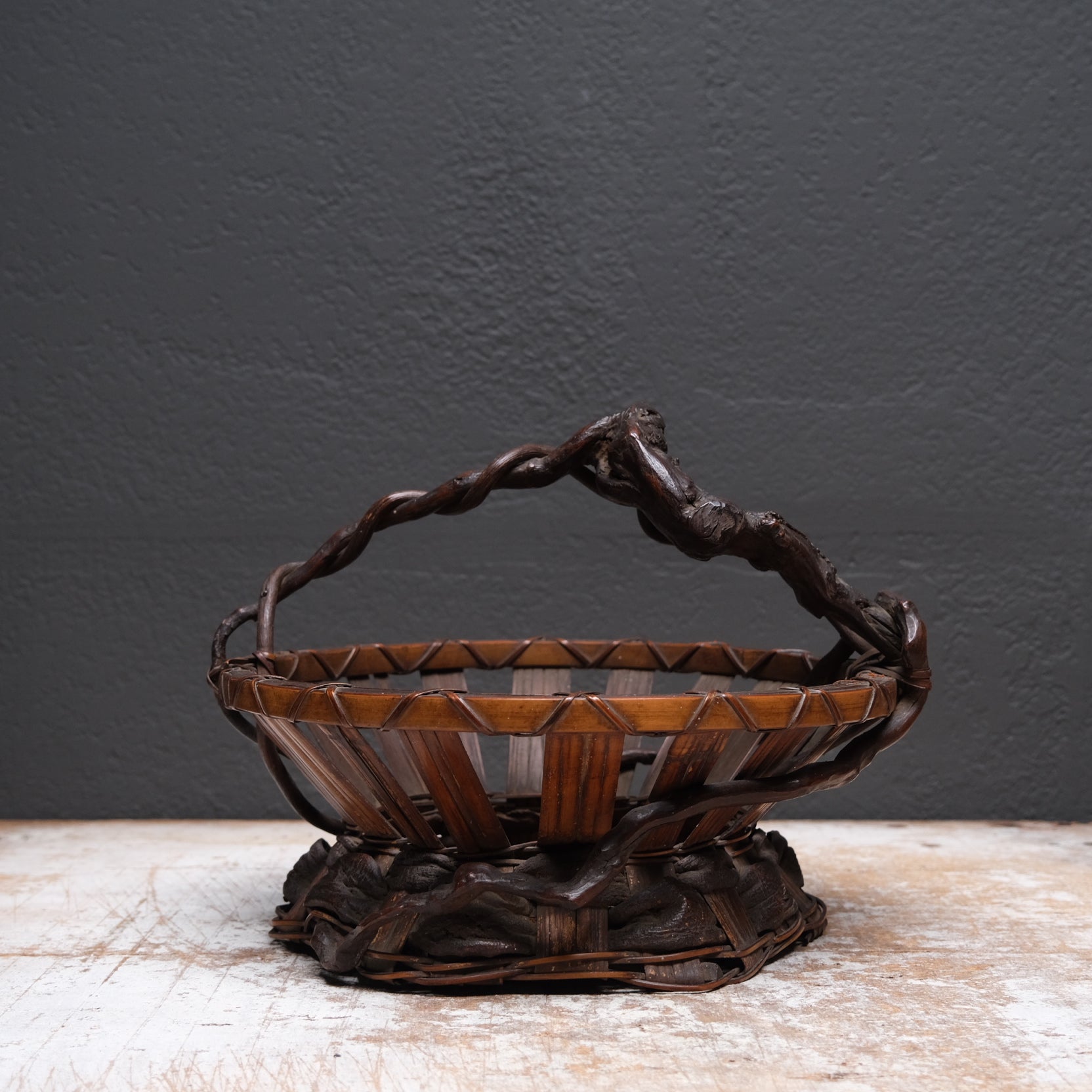 A Japanese bamboo fruit basket with interwoven wisteria root inclusions and an overhead handle. The round basket has an hourglass waist made of simple split bamboo, with the lower part featuring the additional interwoven wisteria.