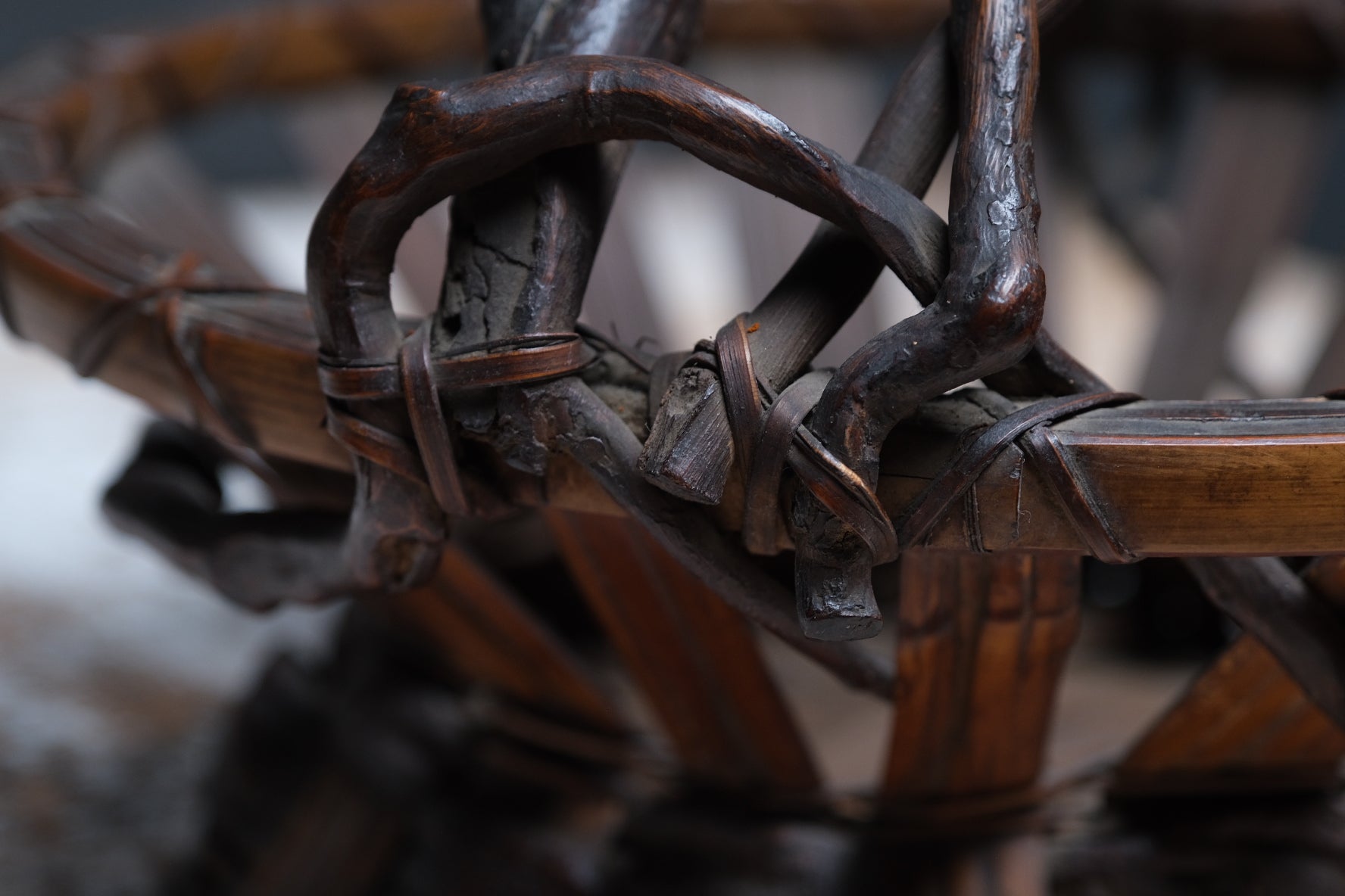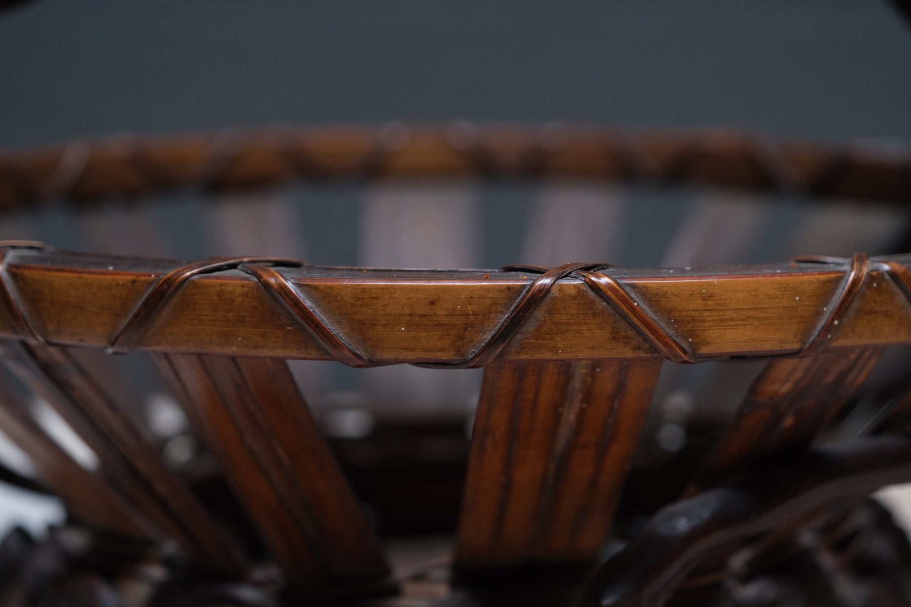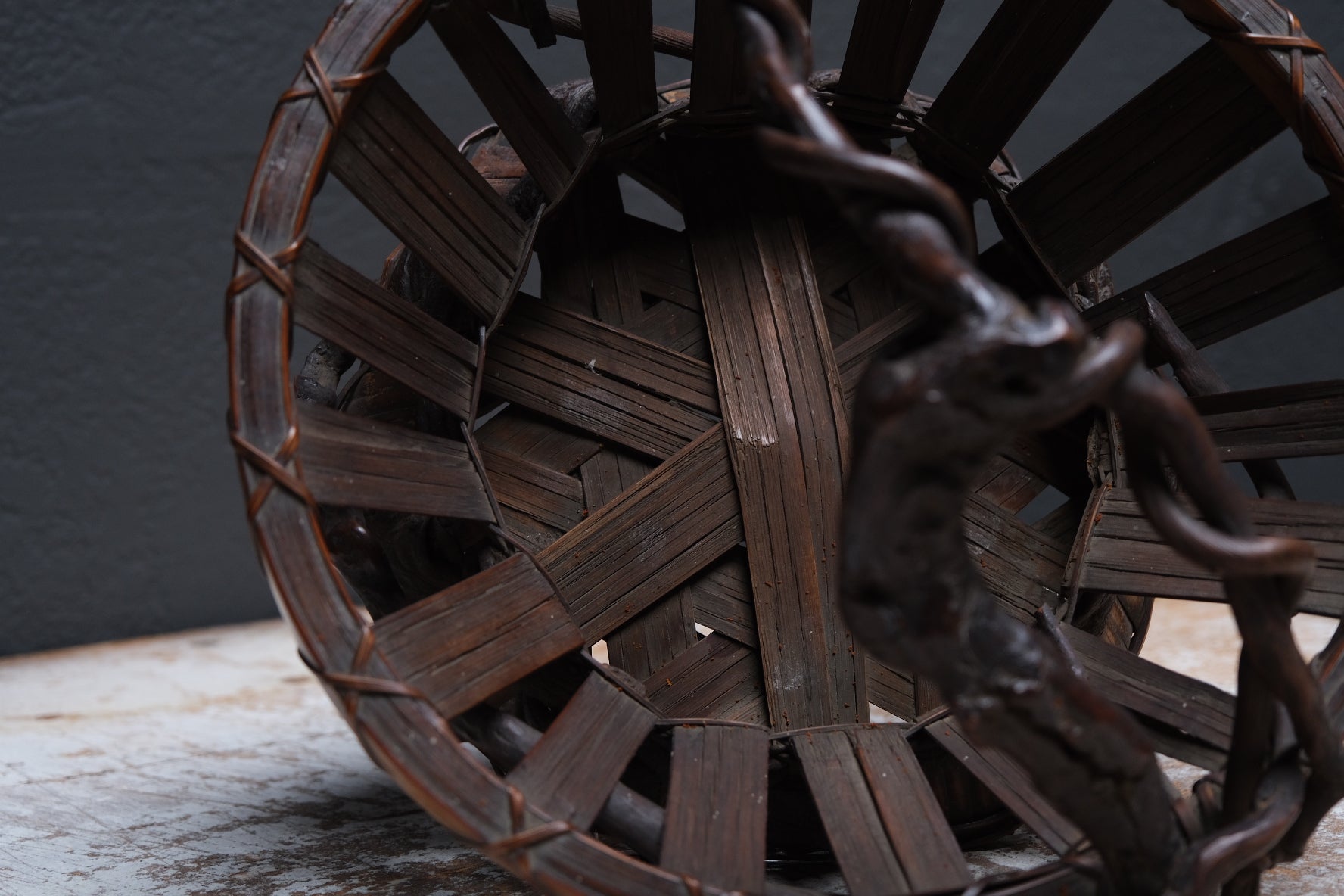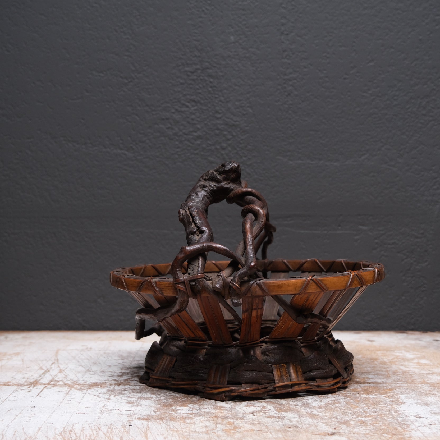 A Japanese bamboo fruit basket with interwoven wisteria root inclusions and an overhead handle. The round basket has an hourglass waist made of simple split bamboo, with the lower part featuring the additional interwoven wisteria.
