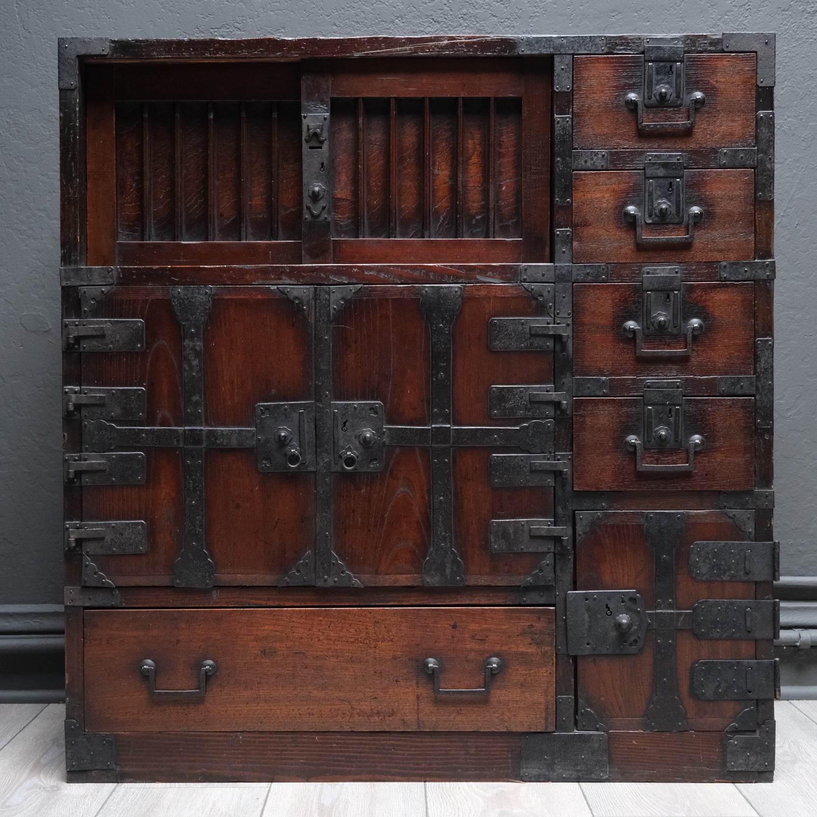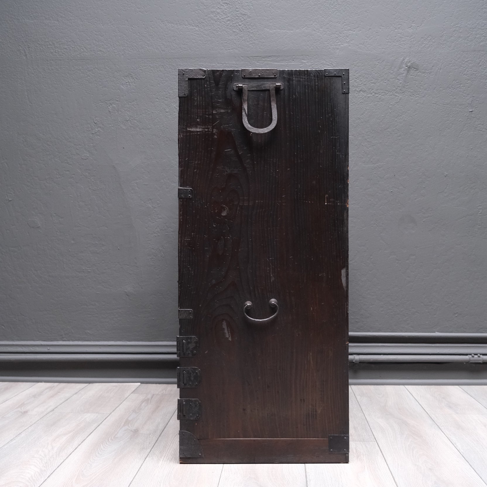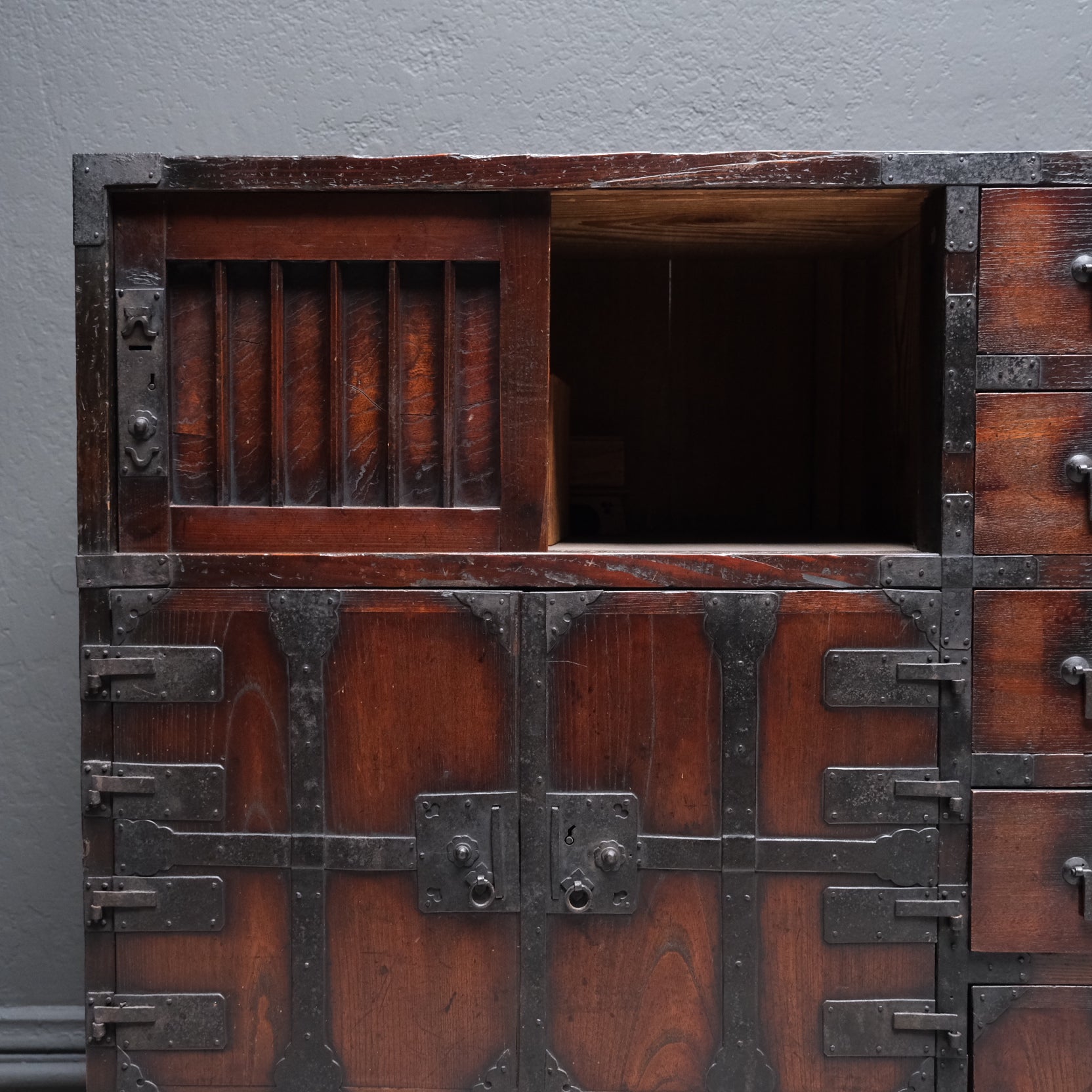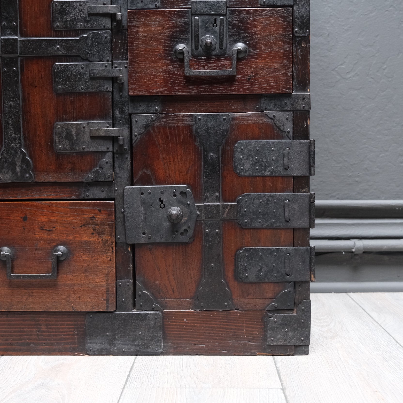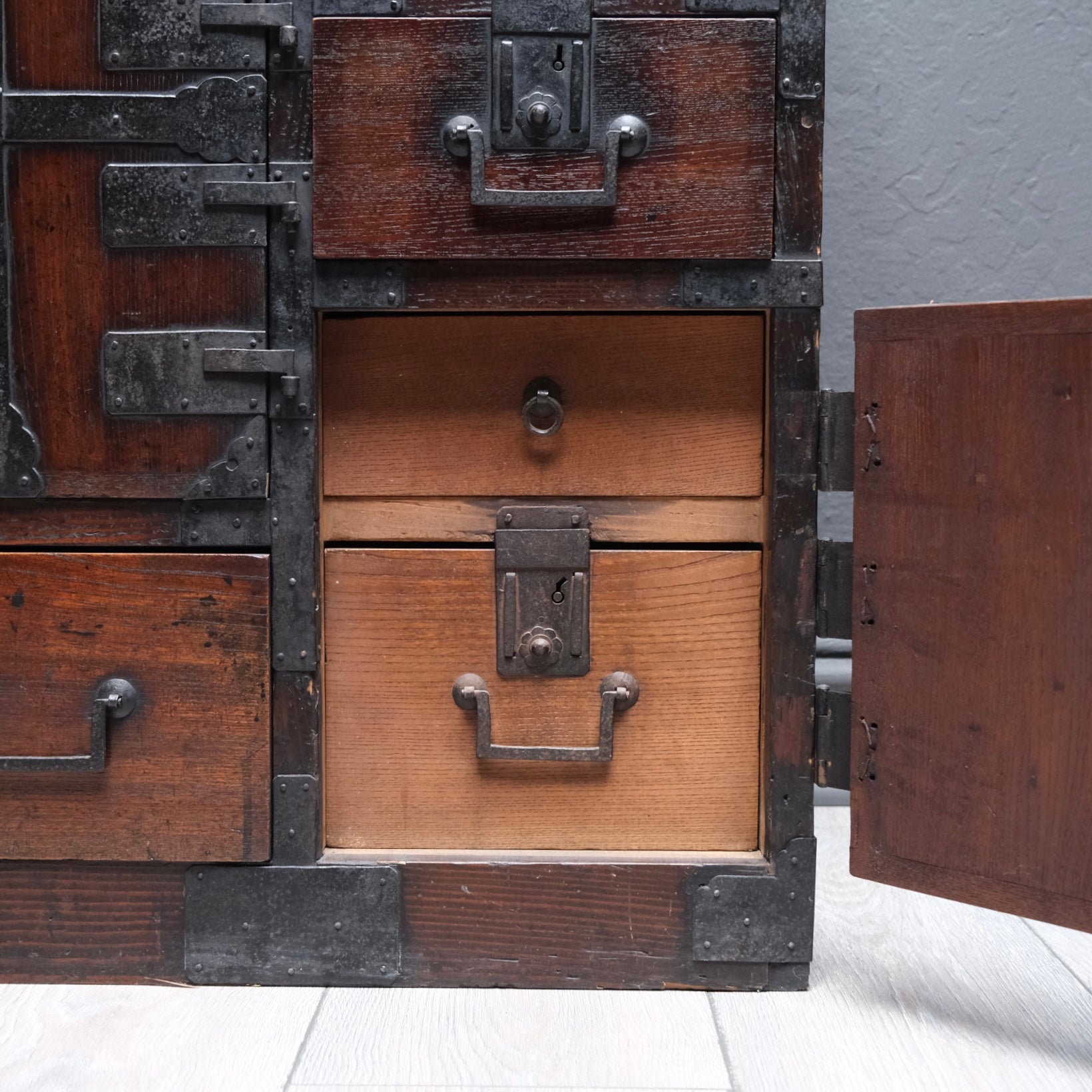 Fine choba-dansu or office chest for home-based businesses used to store ink, brushes and shop records. This example originates from the Matsumoto region and features beautiful hardware.