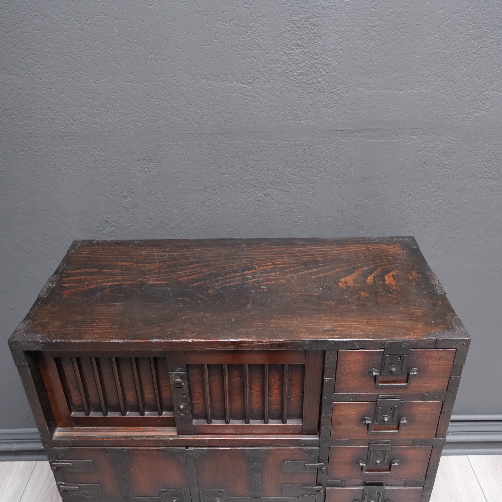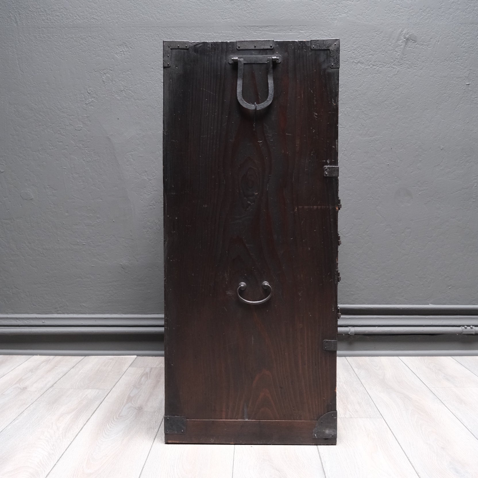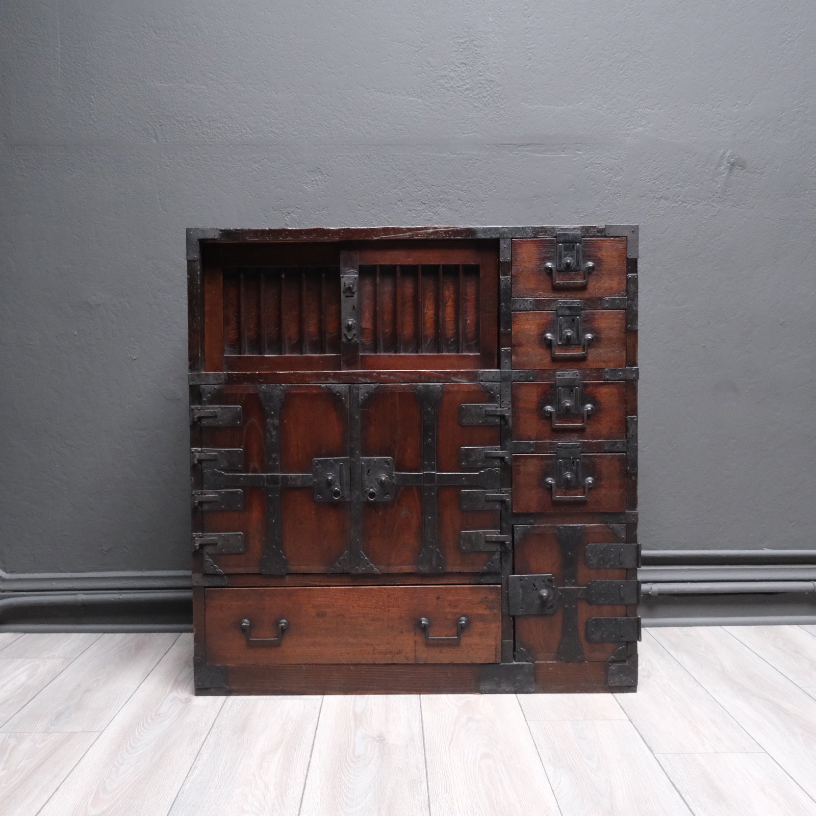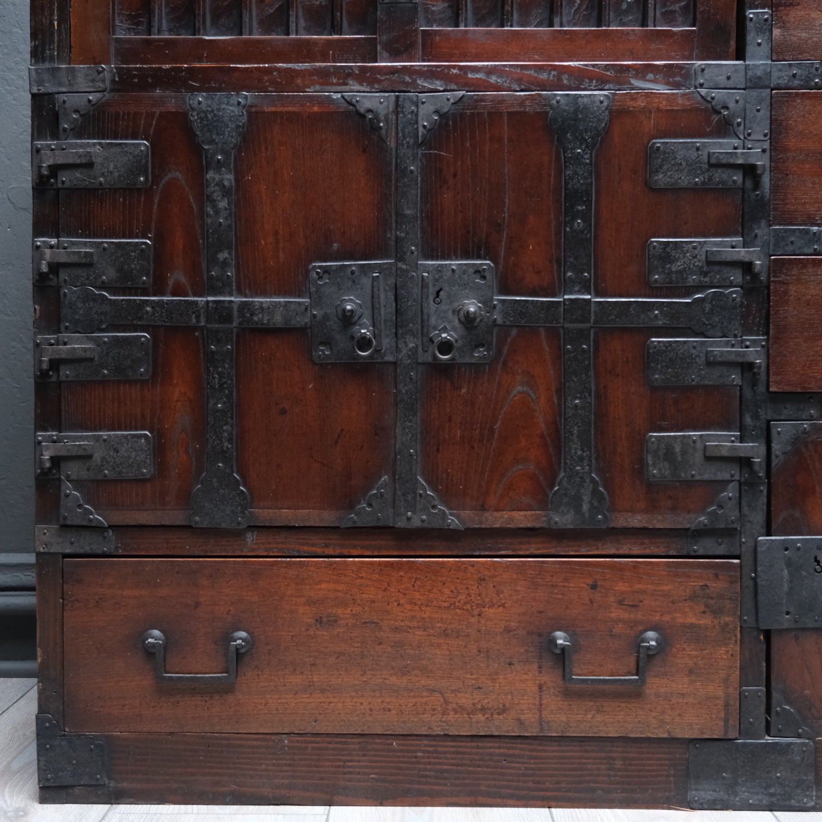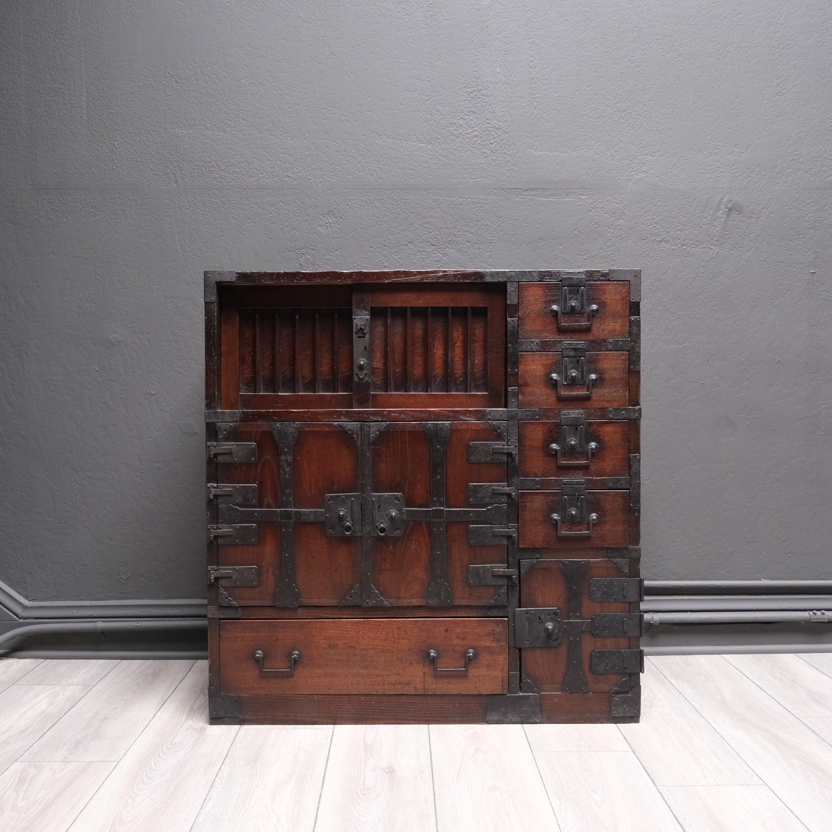 Fine choba-dansu or office chest for home-based businesses used to store ink, brushes and shop records. This example originates from the Matsumoto region and features beautiful hardware.