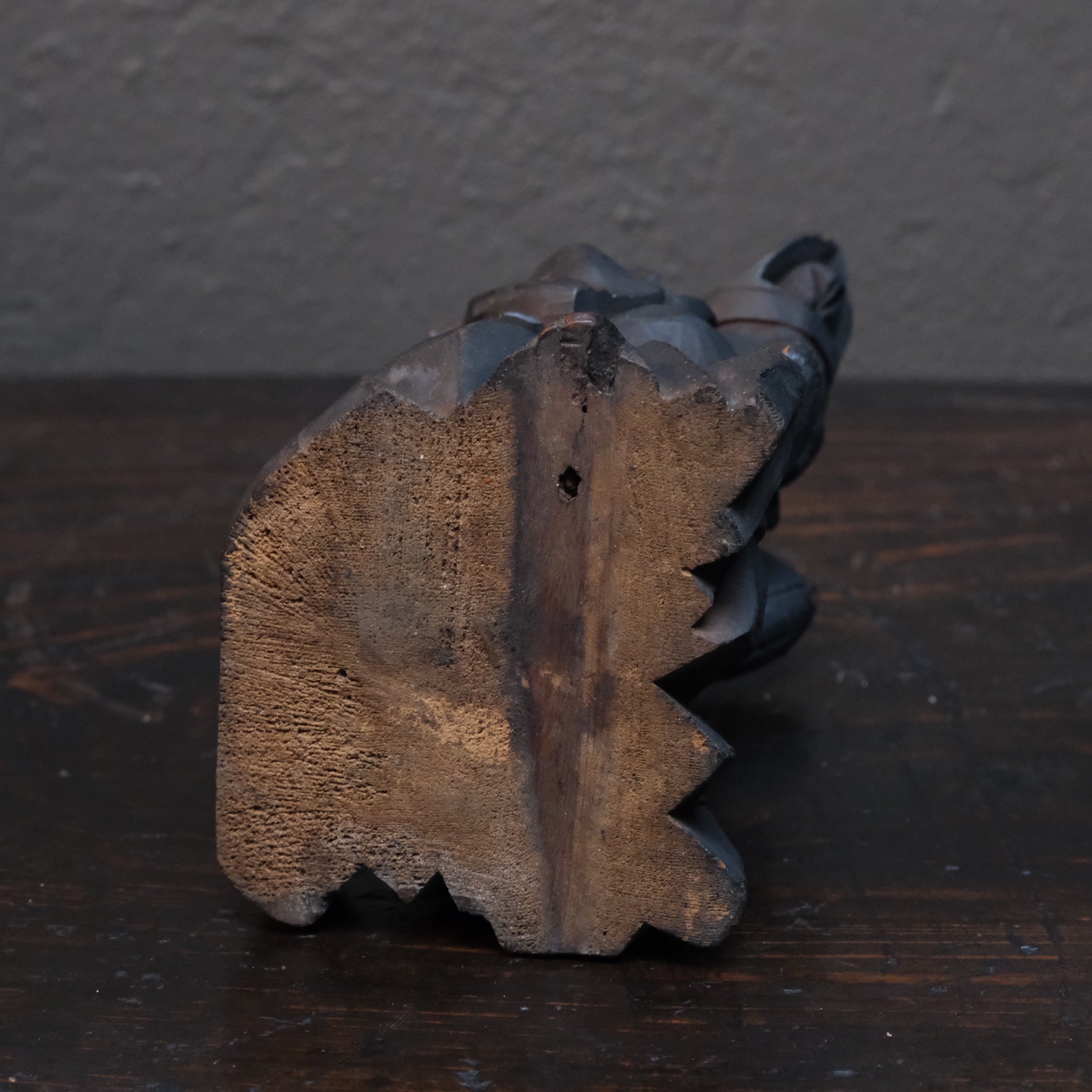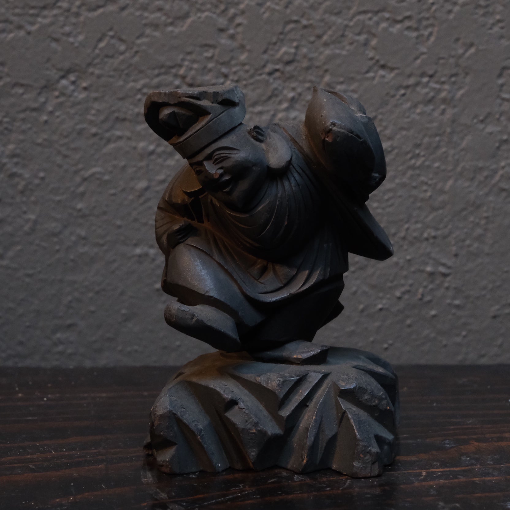 A Japanese wooden statue of Daikoku, the god of wealth, agriculture, and household prosperity. Shown seated with his mallet and treasure sack, the figure embodies good fortune and abundance. The carving displays age and wear, with a softened surface and traces of handling that lend warmth and character to the piece.