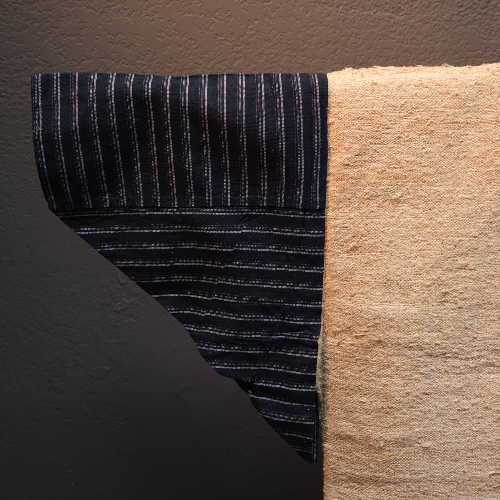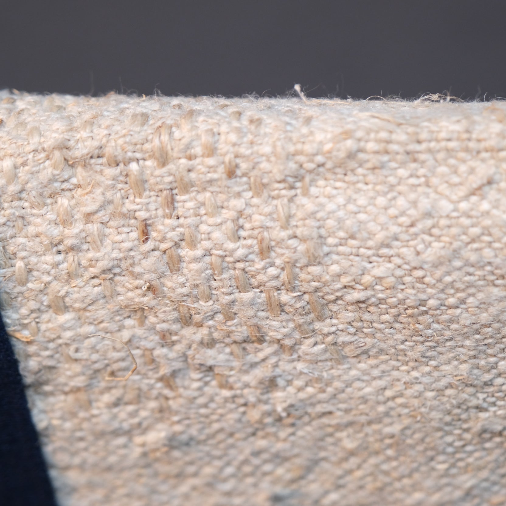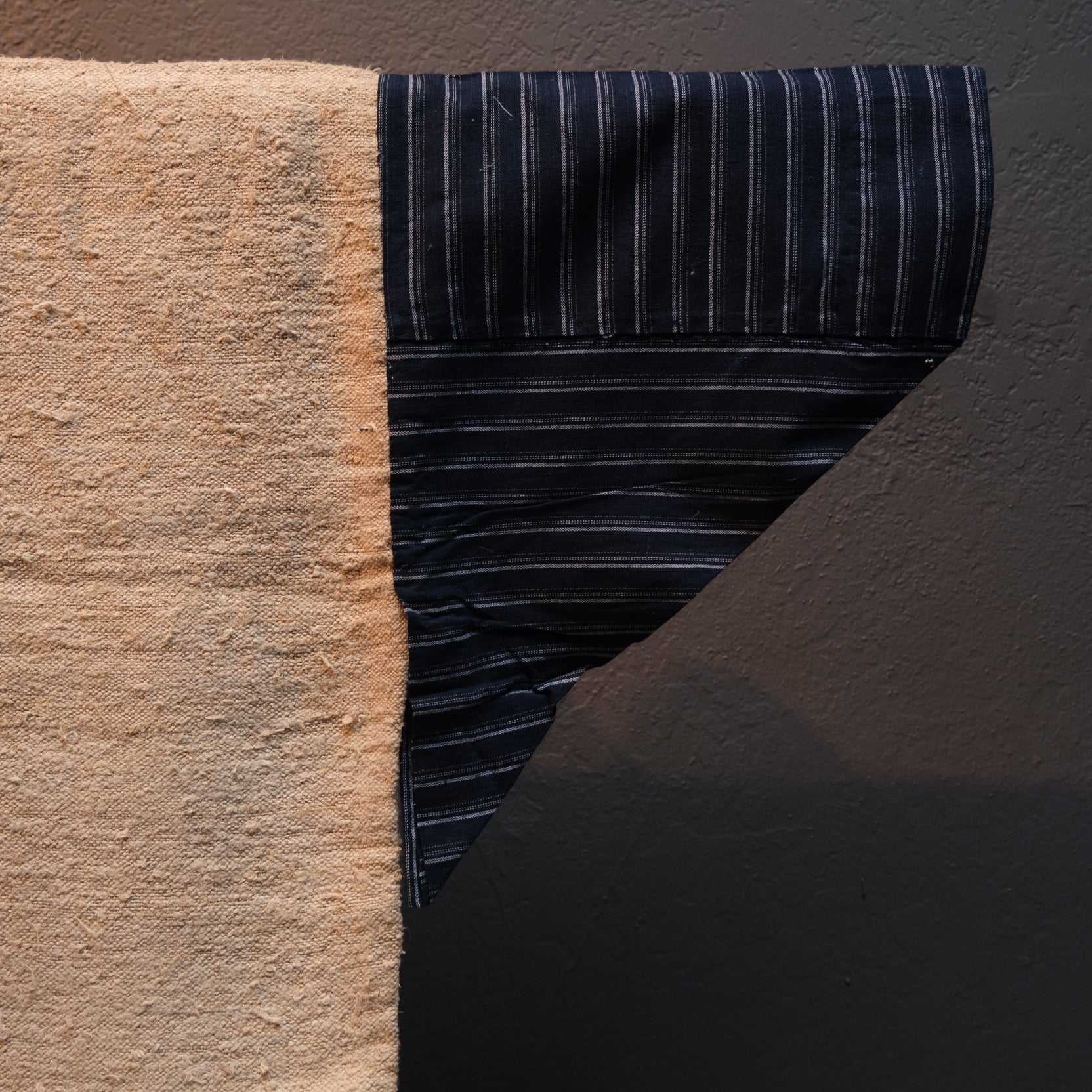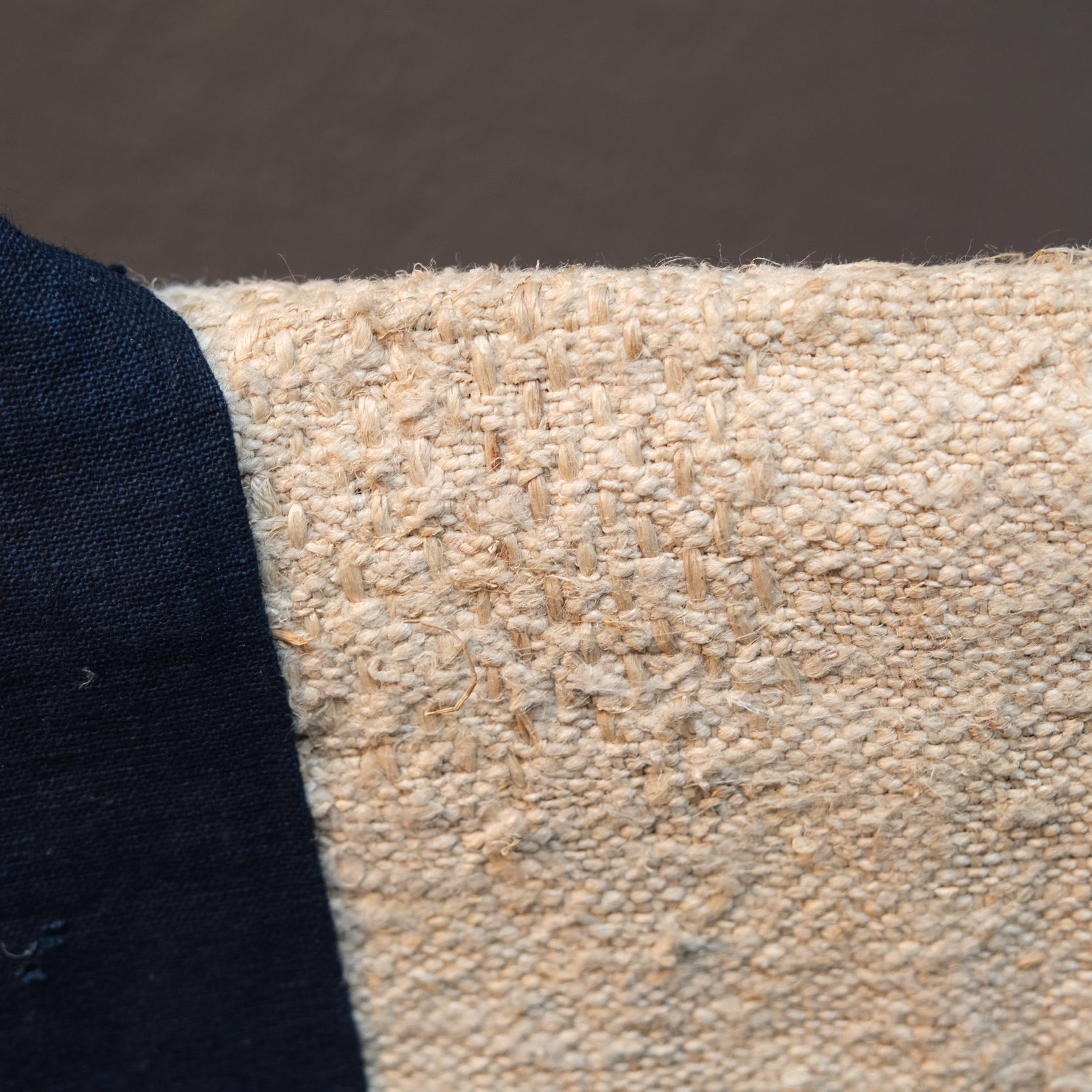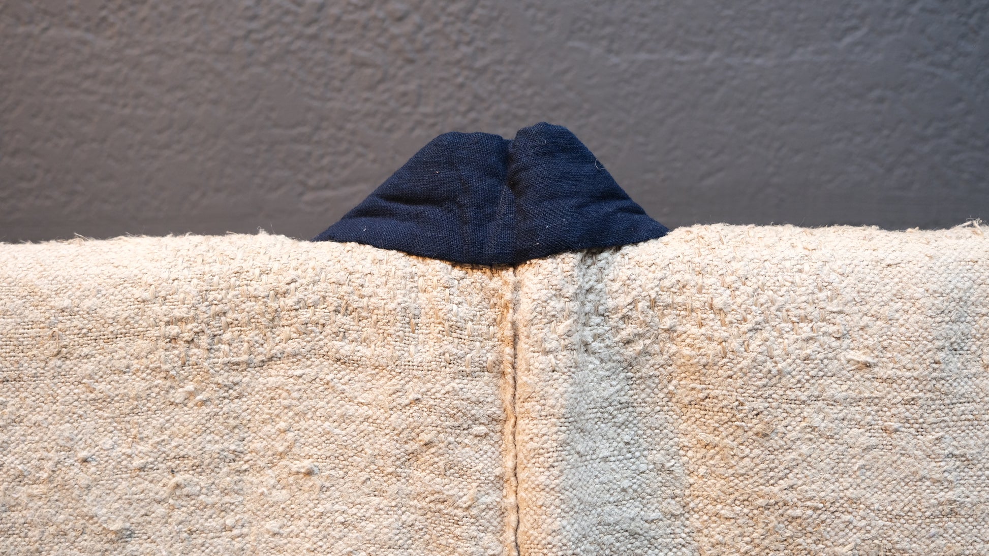 A practical work kimono composed of wisteria fabric (fuji-iro) for the entire body. The composition relies purely on color contrast: a light body paired with dark blue arms chosen for durability and ease of replacement. The cloth presents an even, piece-dyed tone with a dry hand typical of handwoven cotton; seams and hems are neatly hand-stitched. Reinforced with additional stitching near the neck. Some moth damage to the wisteria.