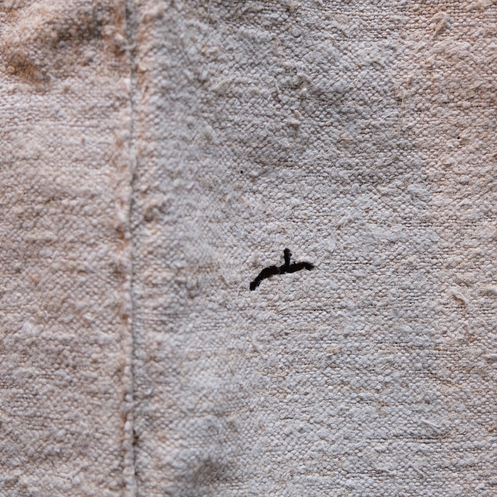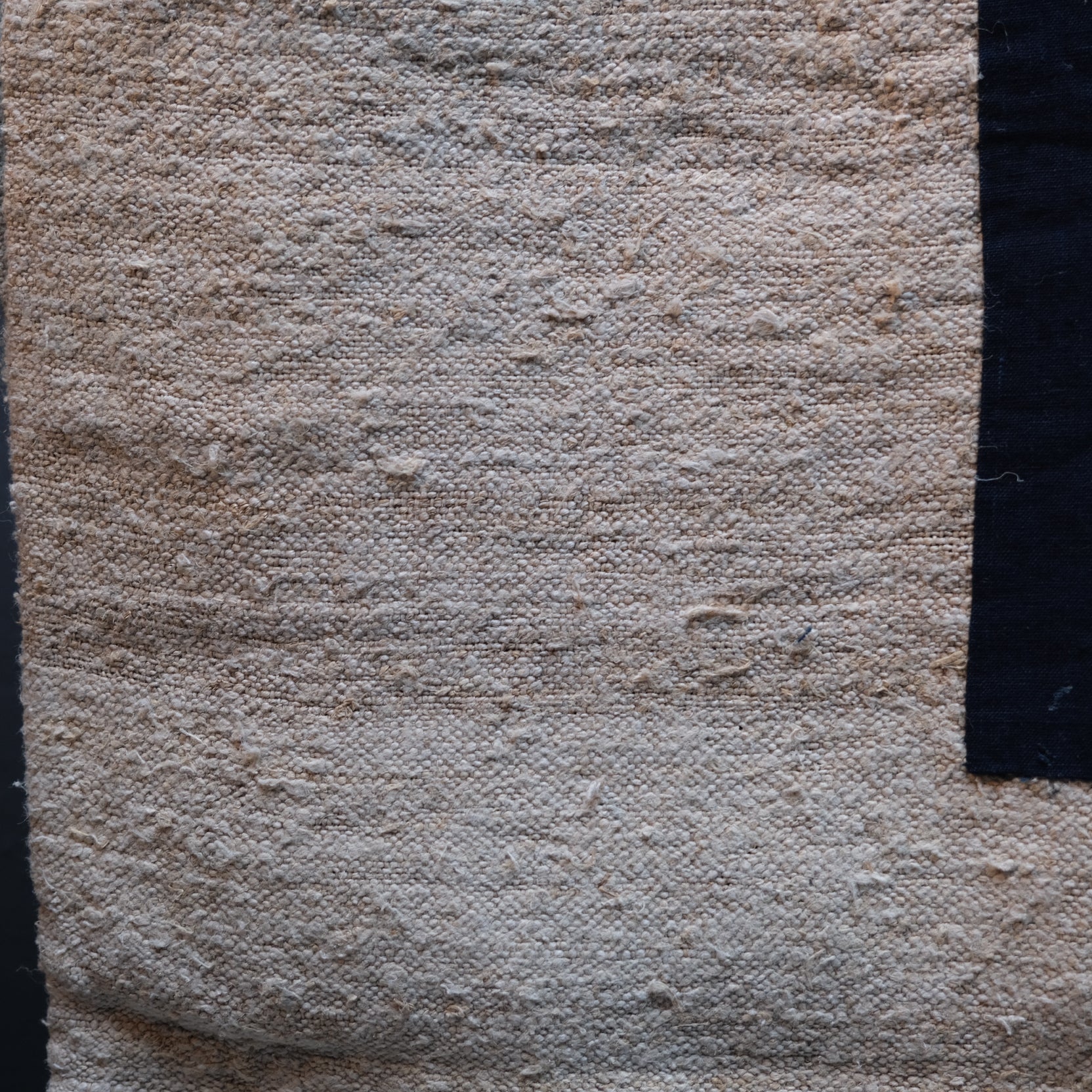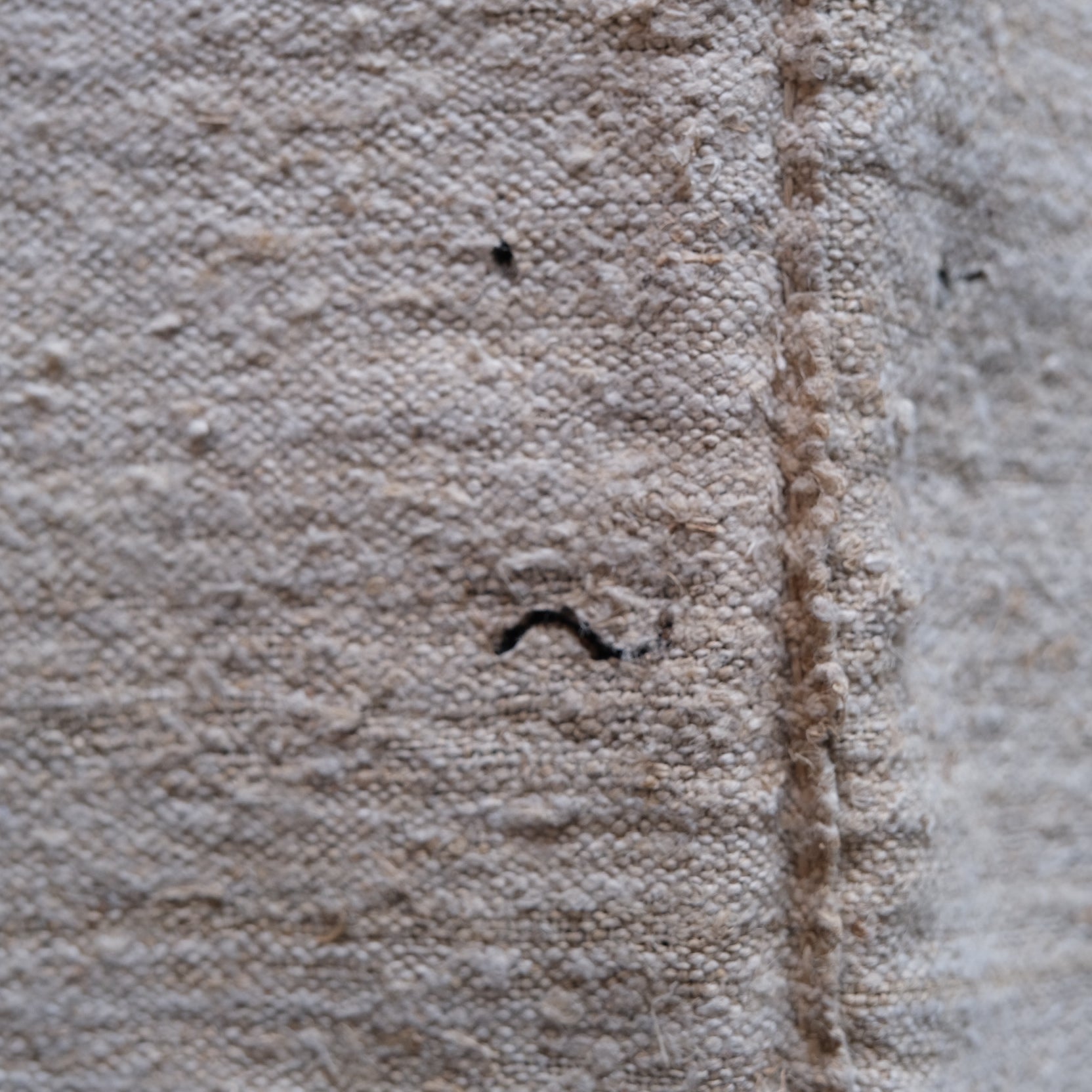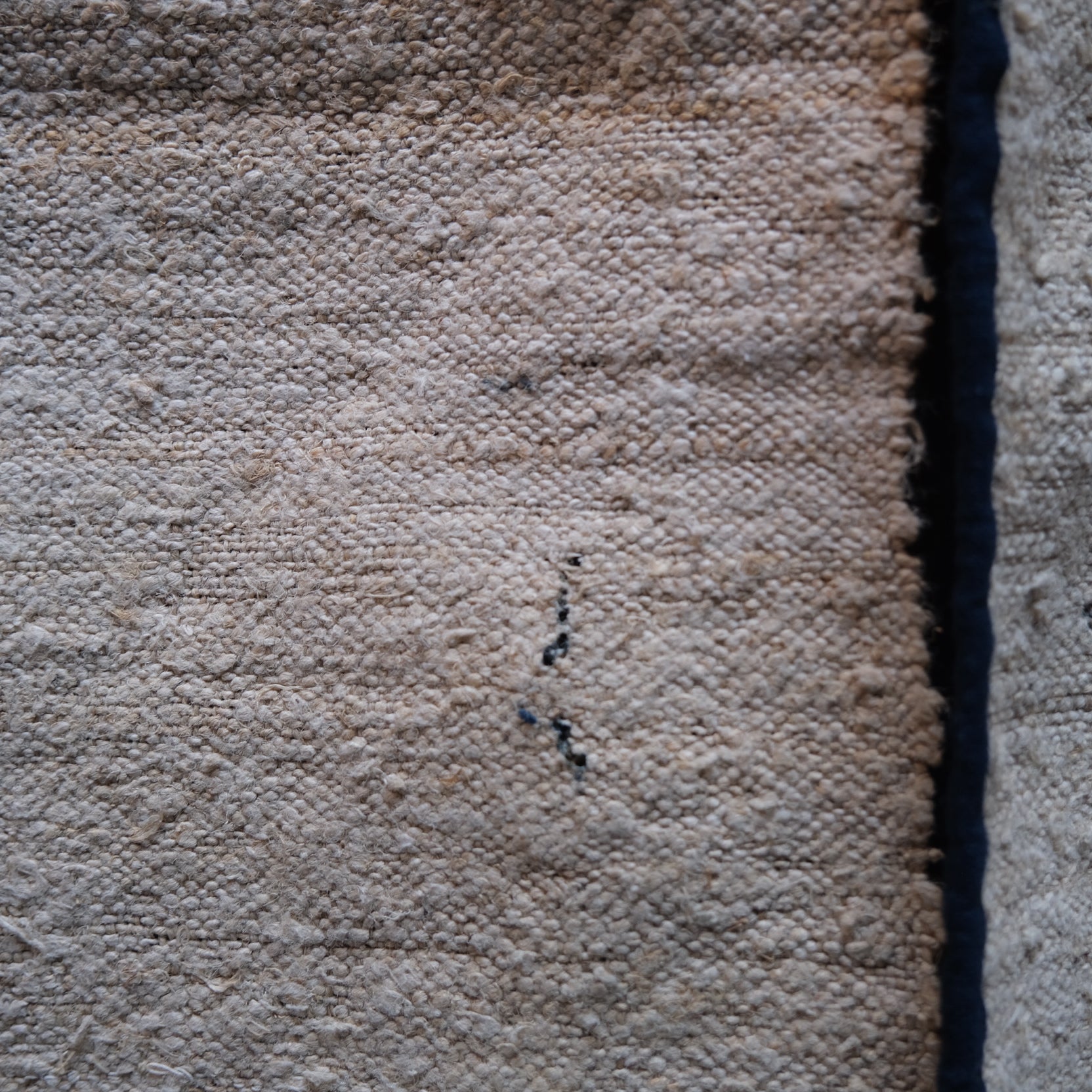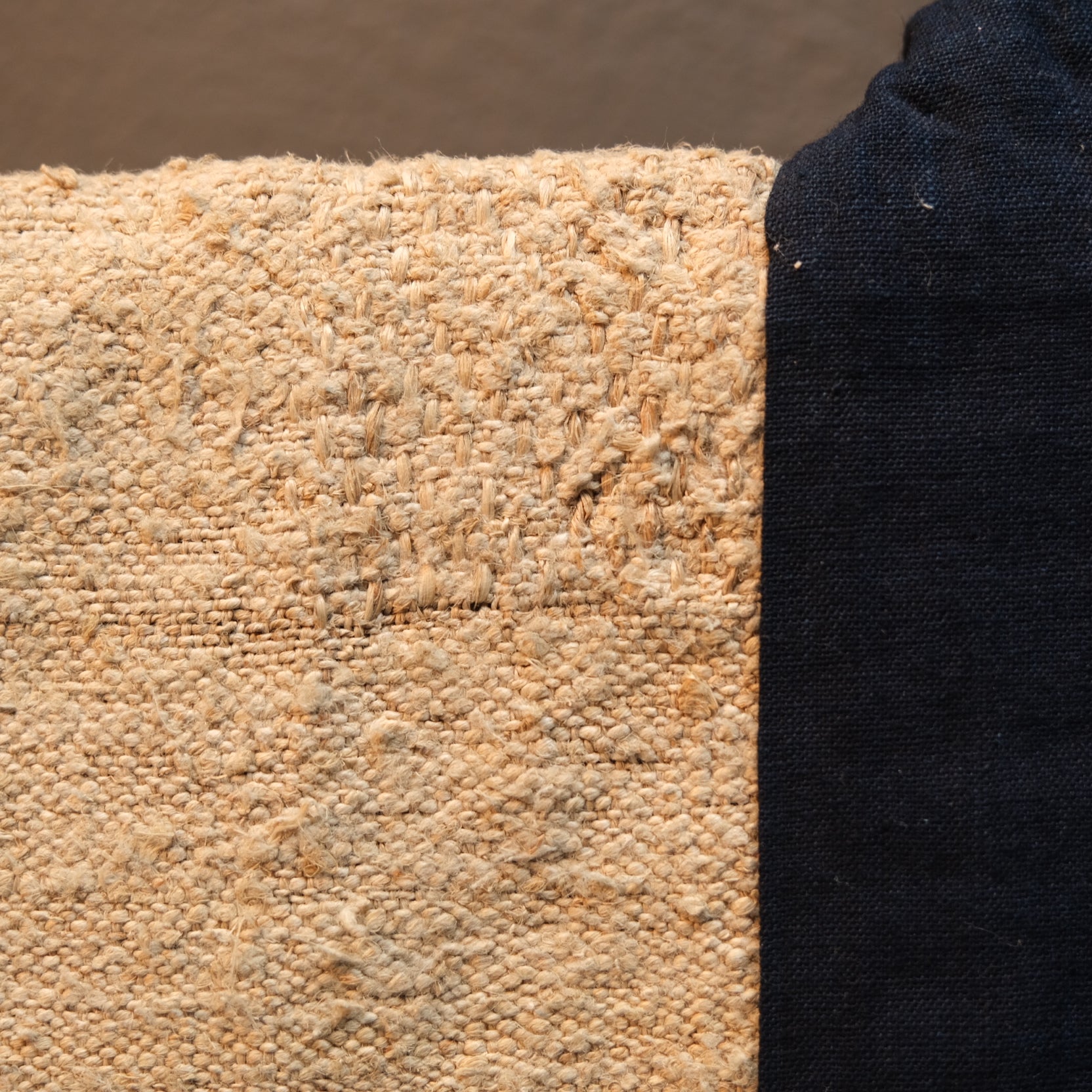 A practical work kimono composed of wisteria fabric (fuji-iro) for the entire body. The composition relies purely on color contrast: a light body paired with dark blue arms chosen for durability and ease of replacement. The cloth presents an even, piece-dyed tone with a dry hand typical of handwoven cotton; seams and hems are neatly hand-stitched. Reinforced with additional stitching near the neck. Some moth damage to the wisteria.