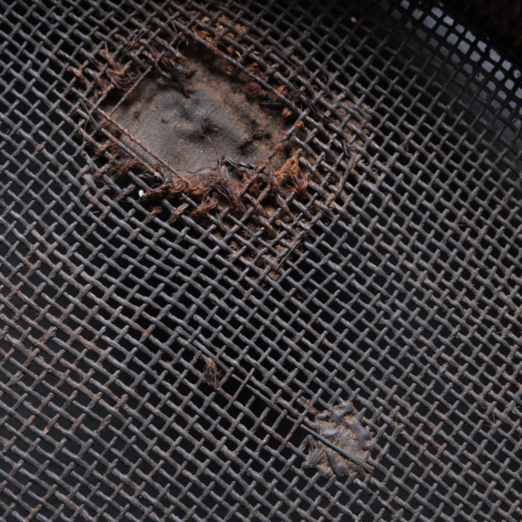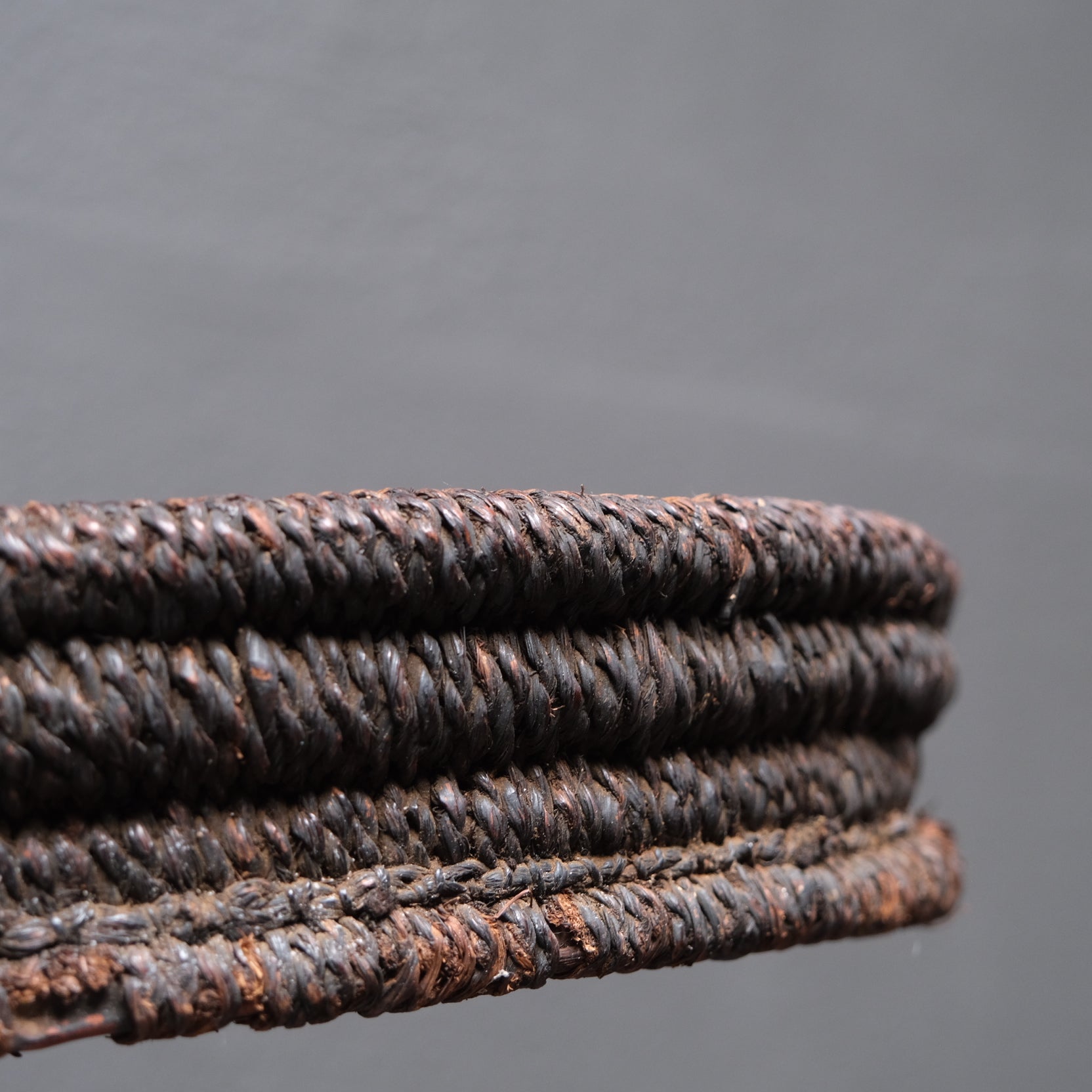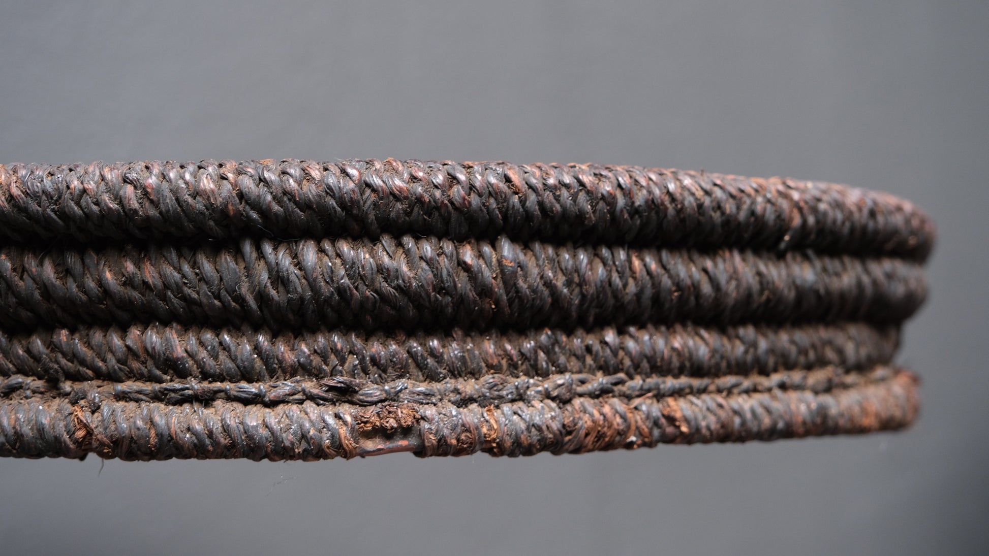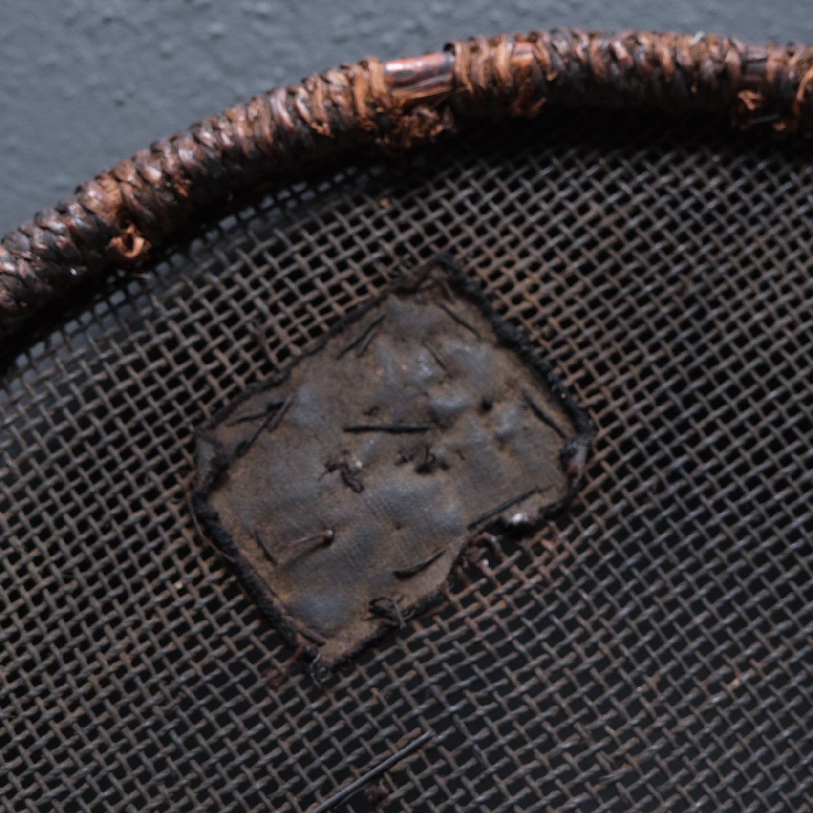 Old folk basket with repairs. The bamboo frame reinforced with a braided fibrous material, possibly a type of grass. Possibly used as for winnowing or to carry light foodstuffs. The condition reflects the heavy use of the basket.