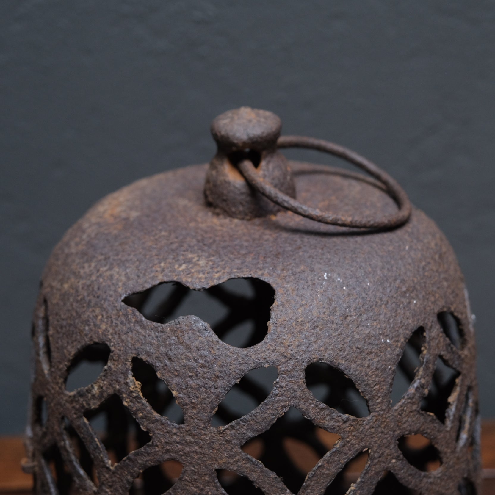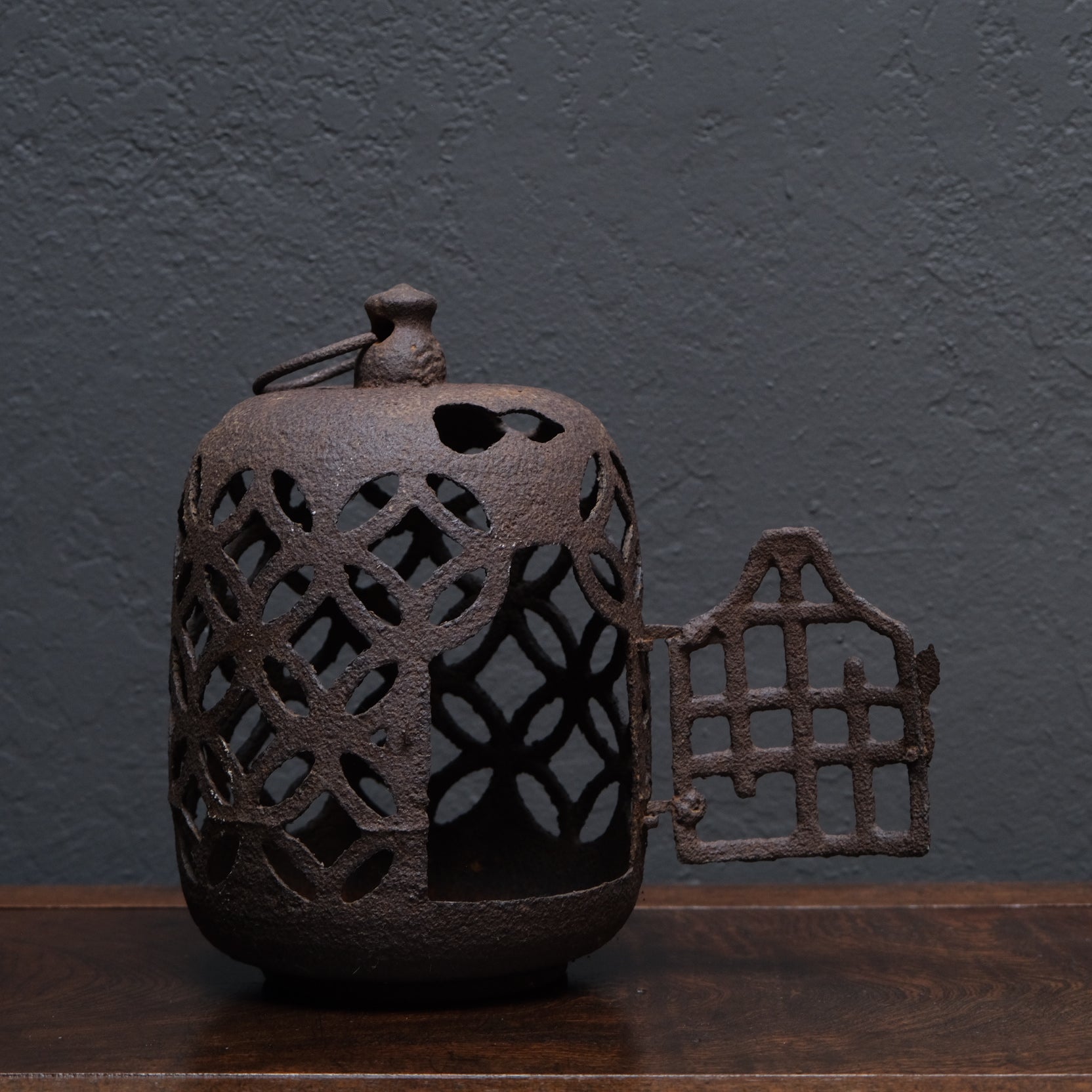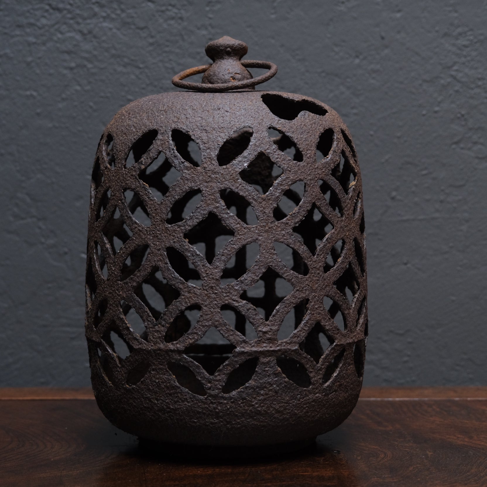 Reticulated oval iron lantern decorated with interlocking coin motifs, symbolic of wealth, prosperity, and good fortune. Such designs were often incorporated into household and temple furnishings to invite abundance and protection, while the openwork structure cast patterned light that enhanced both practical use and aesthetic effect.