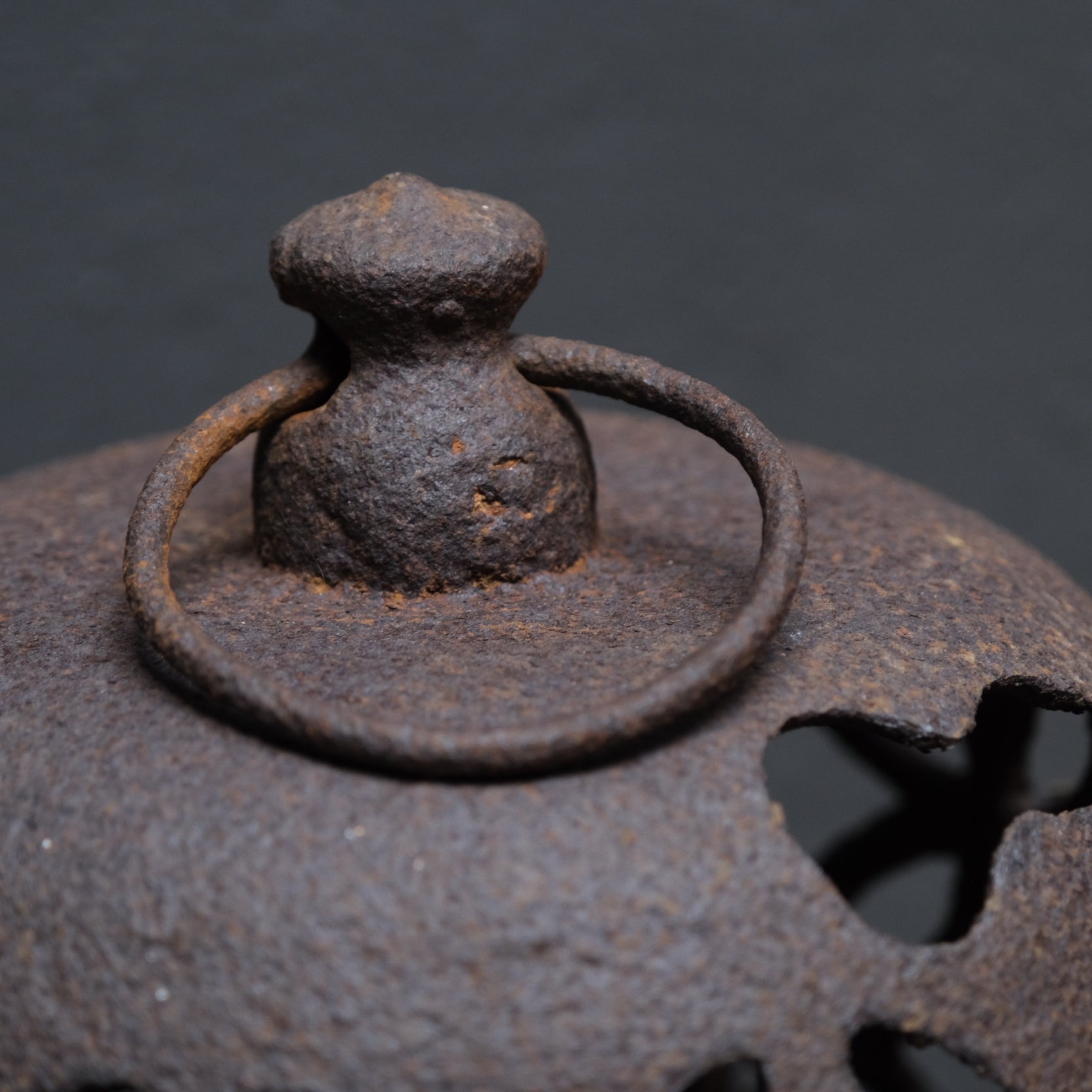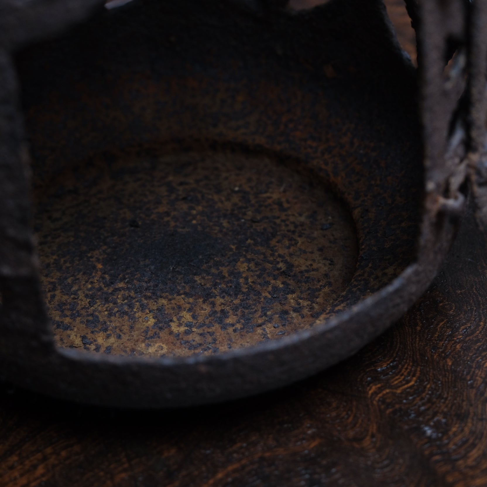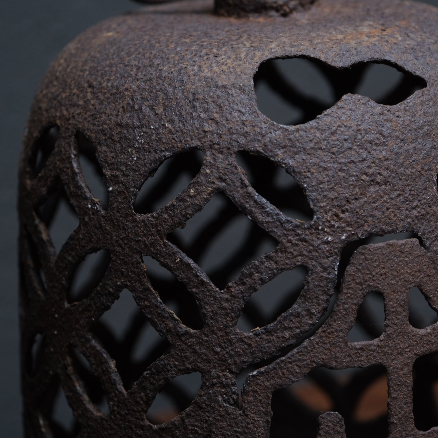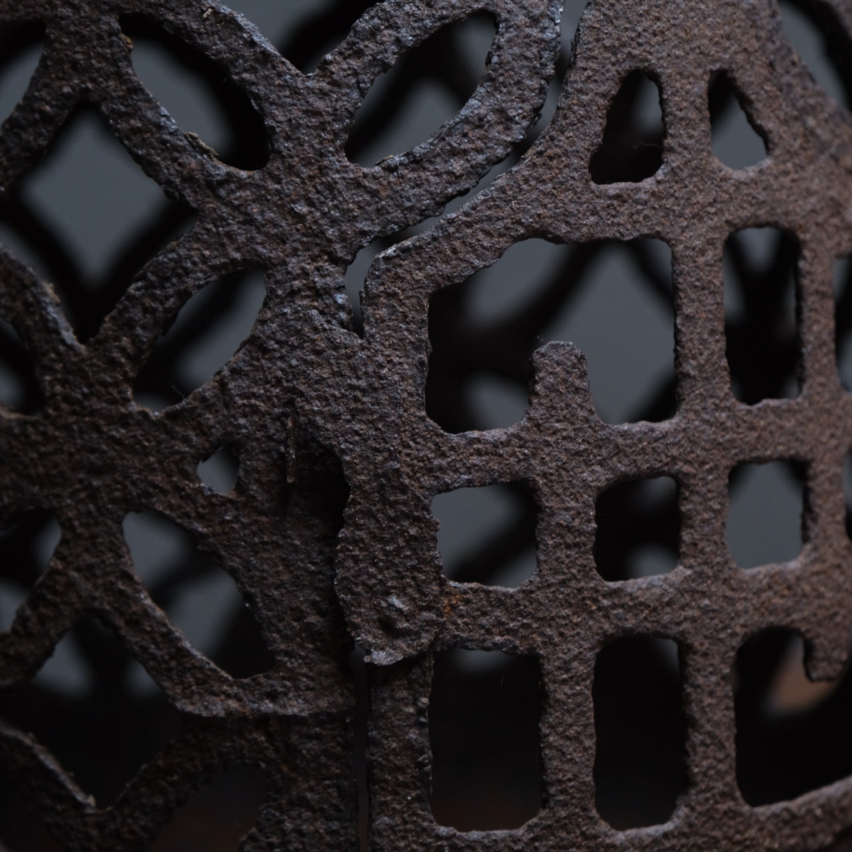Reticulated oval iron lantern decorated with interlocking coin motifs, symbolic of wealth, prosperity, and good fortune. Such designs were often incorporated into household and temple furnishings to invite abundance and protection, while the openwork structure cast patterned light that enhanced both practical use and aesthetic effect.
