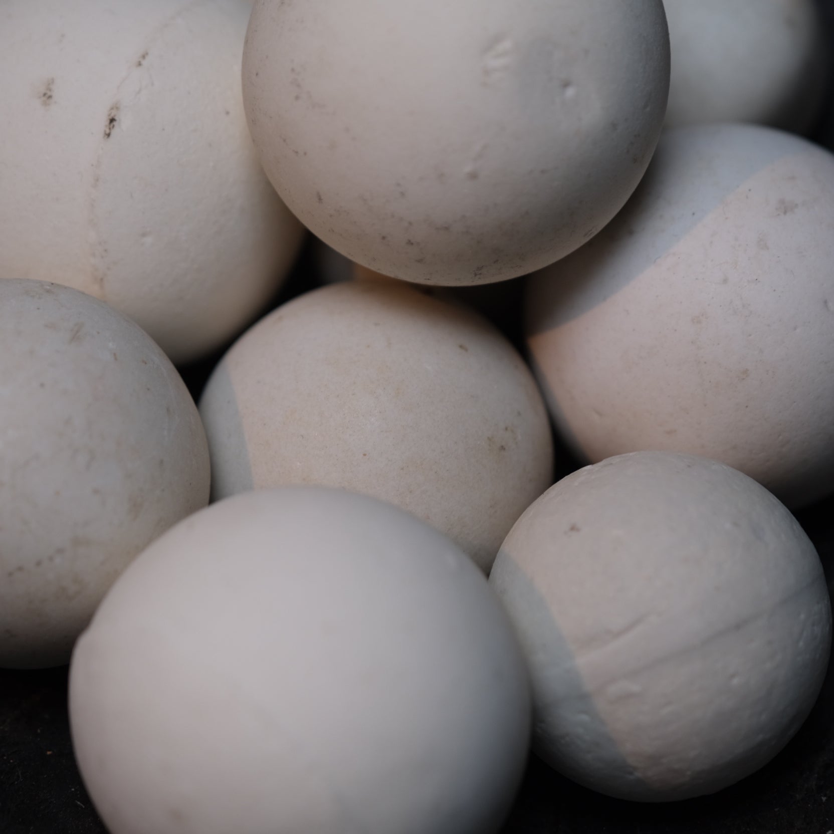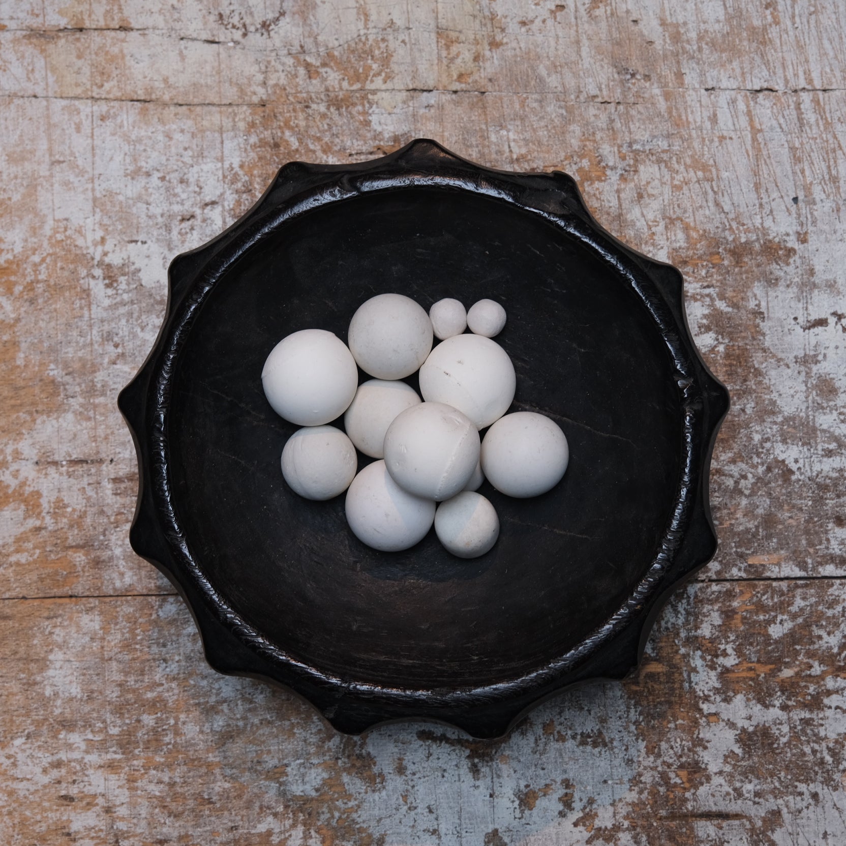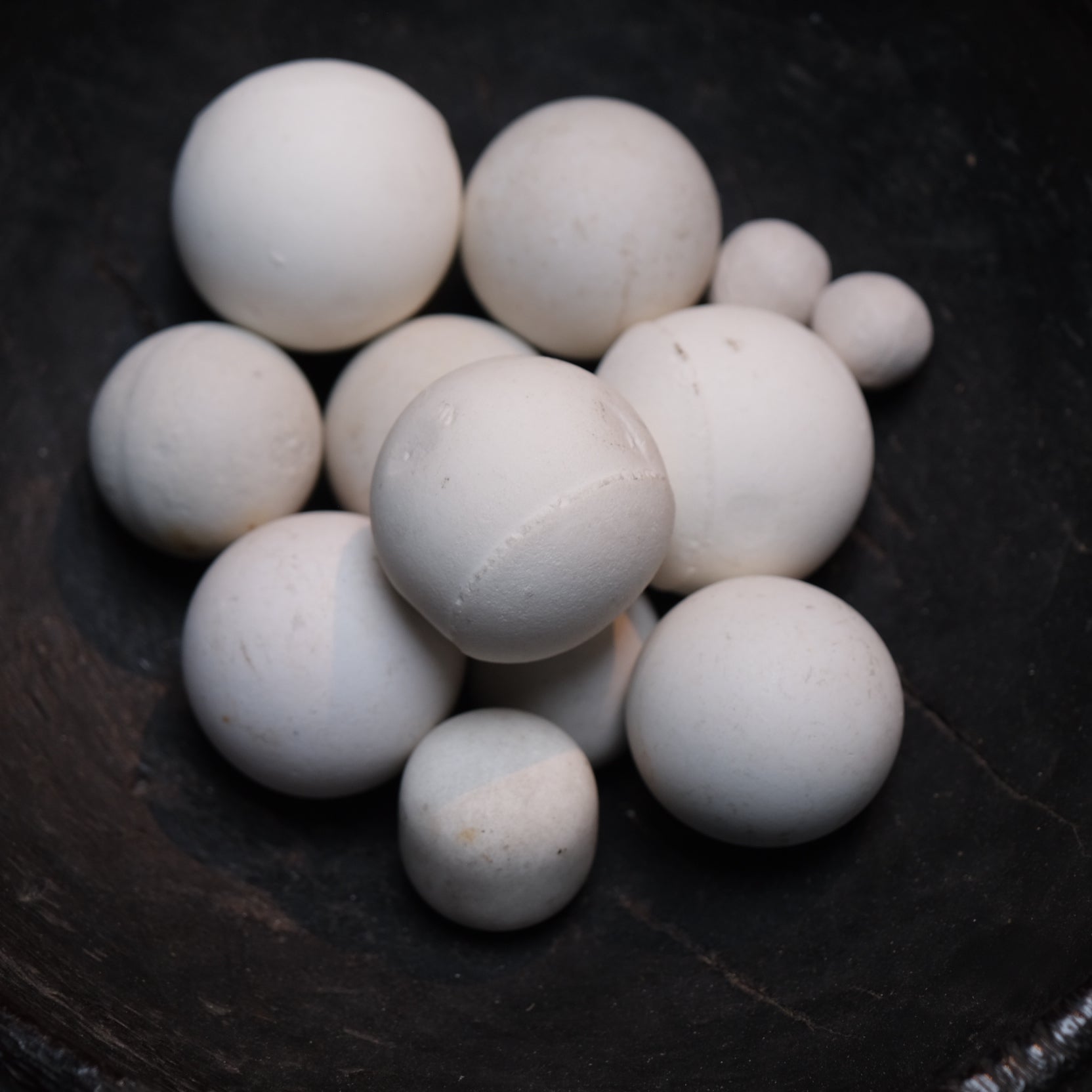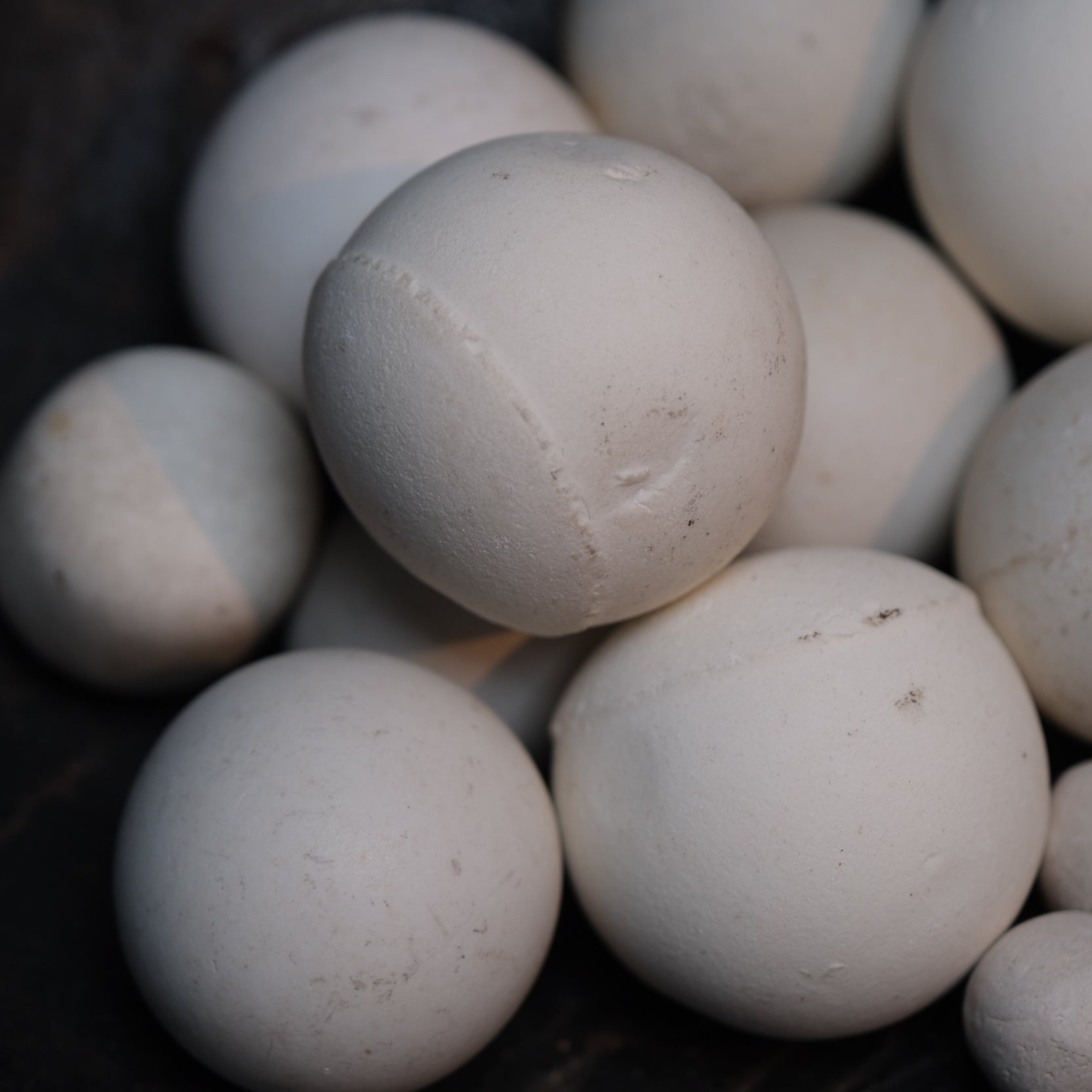Group of spherical hard white stones of unknown origin. Uniform white. Surfaces are mostly even, Tactile and minimal, they read as tools or study forms. Possibly used as burnishers/polishing stones, yet presented simply as sculptural objects.