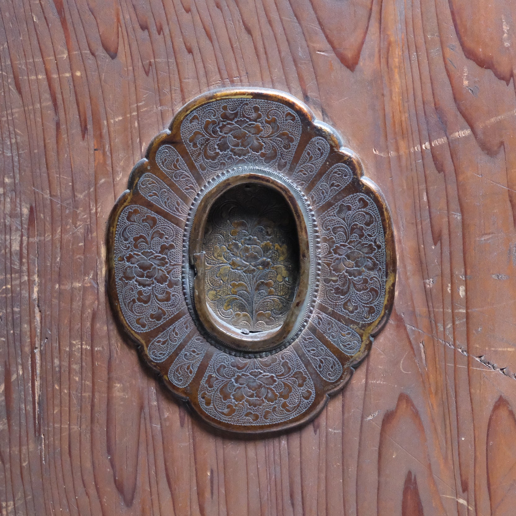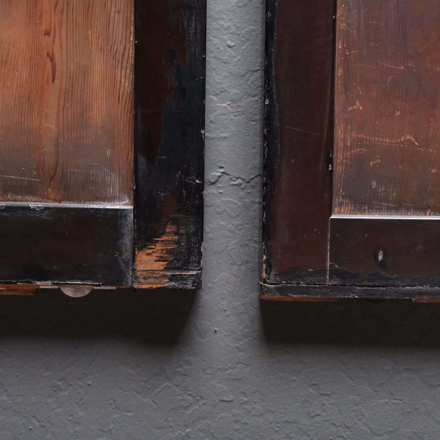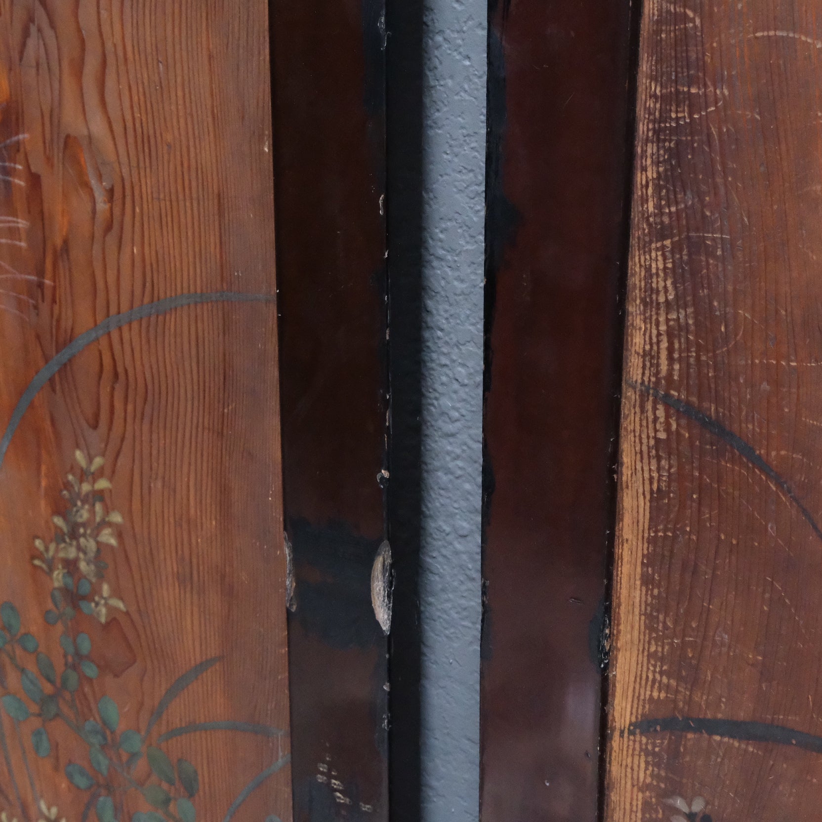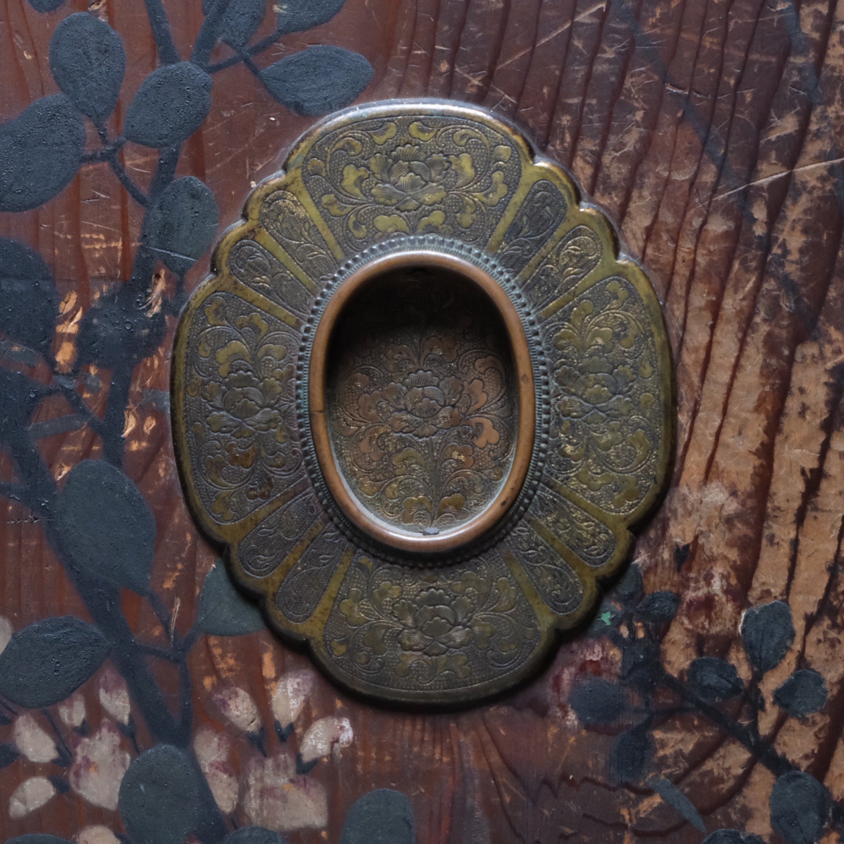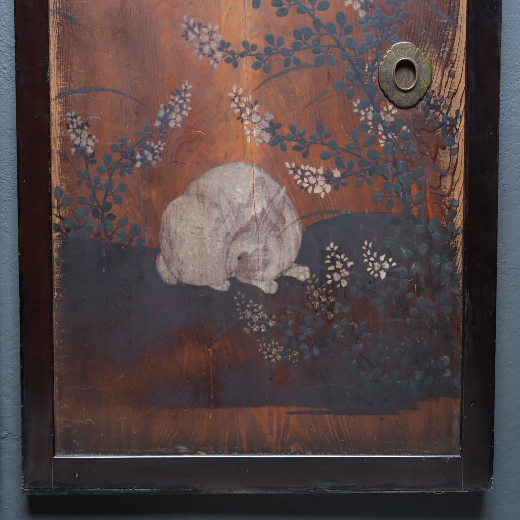 Pair of painted sugi-do (cedar sliding doors), decorated in mineral and gesso pigments with a rabbit and blossoming peony. In Japanese symbolism, the peony represents strength in marriage, while the rabbit is associated with ambition, good fortune, and personal progress. These doors likely date to the late Edo period, circa 1800. Architectural sliding doors can often be dated by height: during the Meiji period (late 19ᵗʰ century) they averaged 69–72" tall, while earlier examples rarely exceeded 68". This makes such early painted doors especially rare.