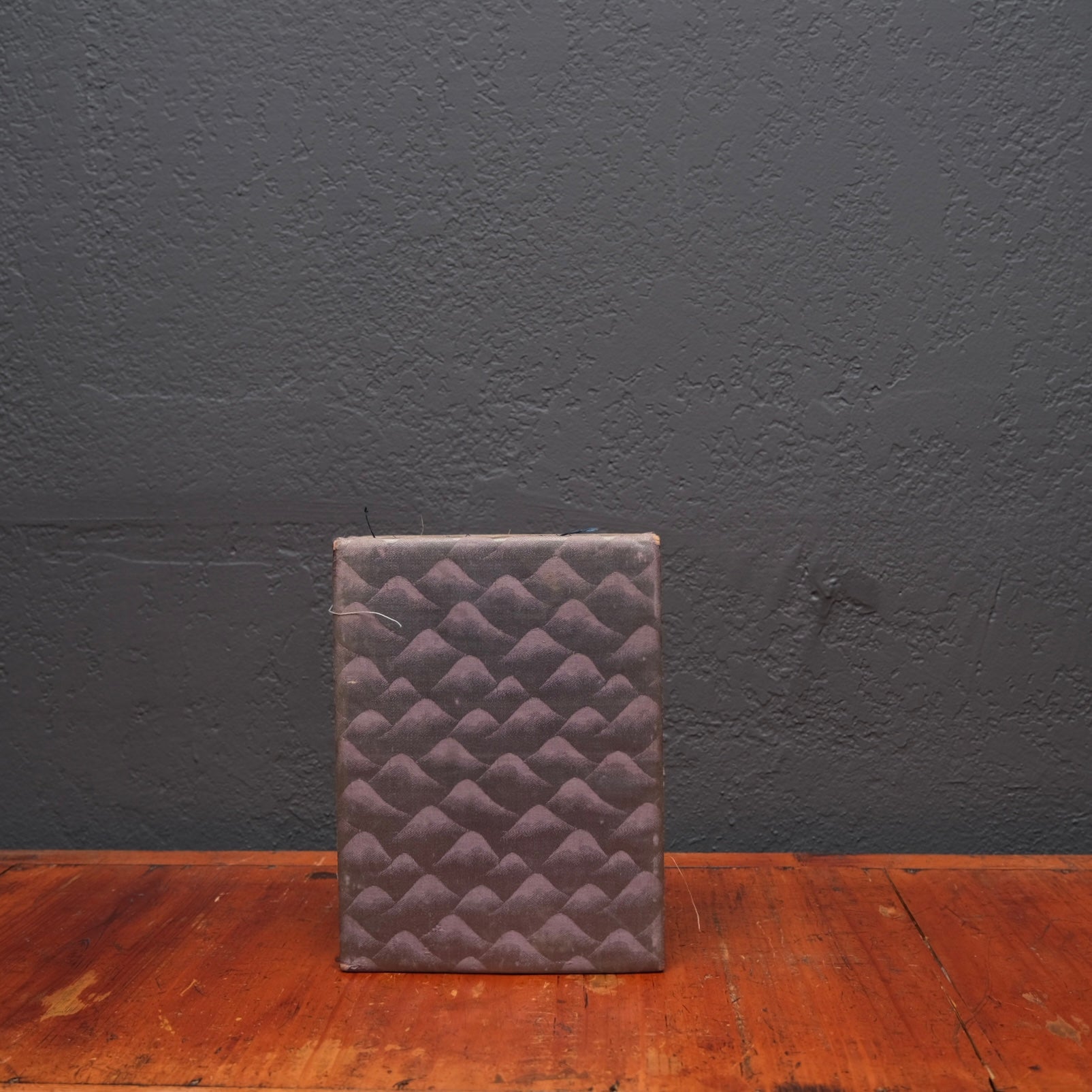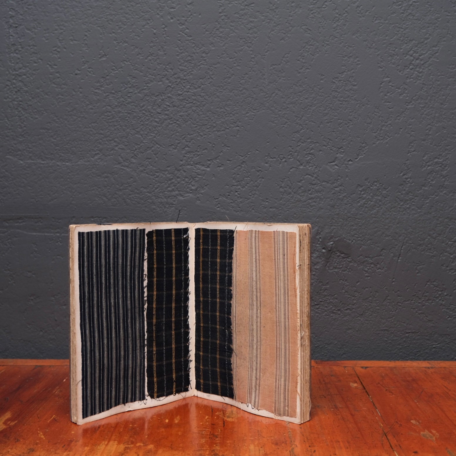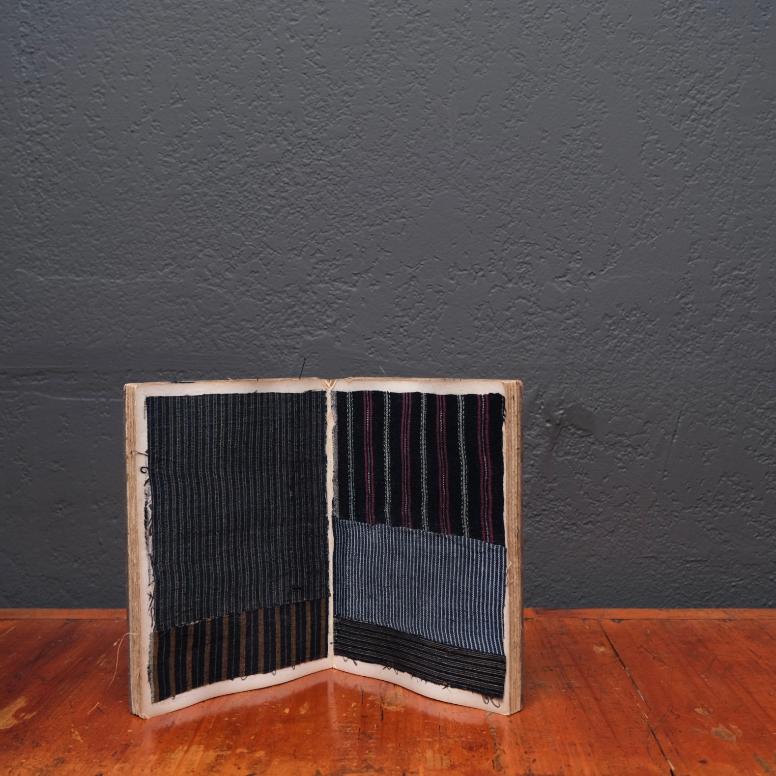 Textile sample book with indigo cotton swatches. Many samples are of shima 縞 (stripes). The book opens in an accordion fashion, and there are swatches on both sides of each page. Possibly from a weaver or collector of indigo fabrics. Silk cover with repeated mountain motif. Overall good condition.