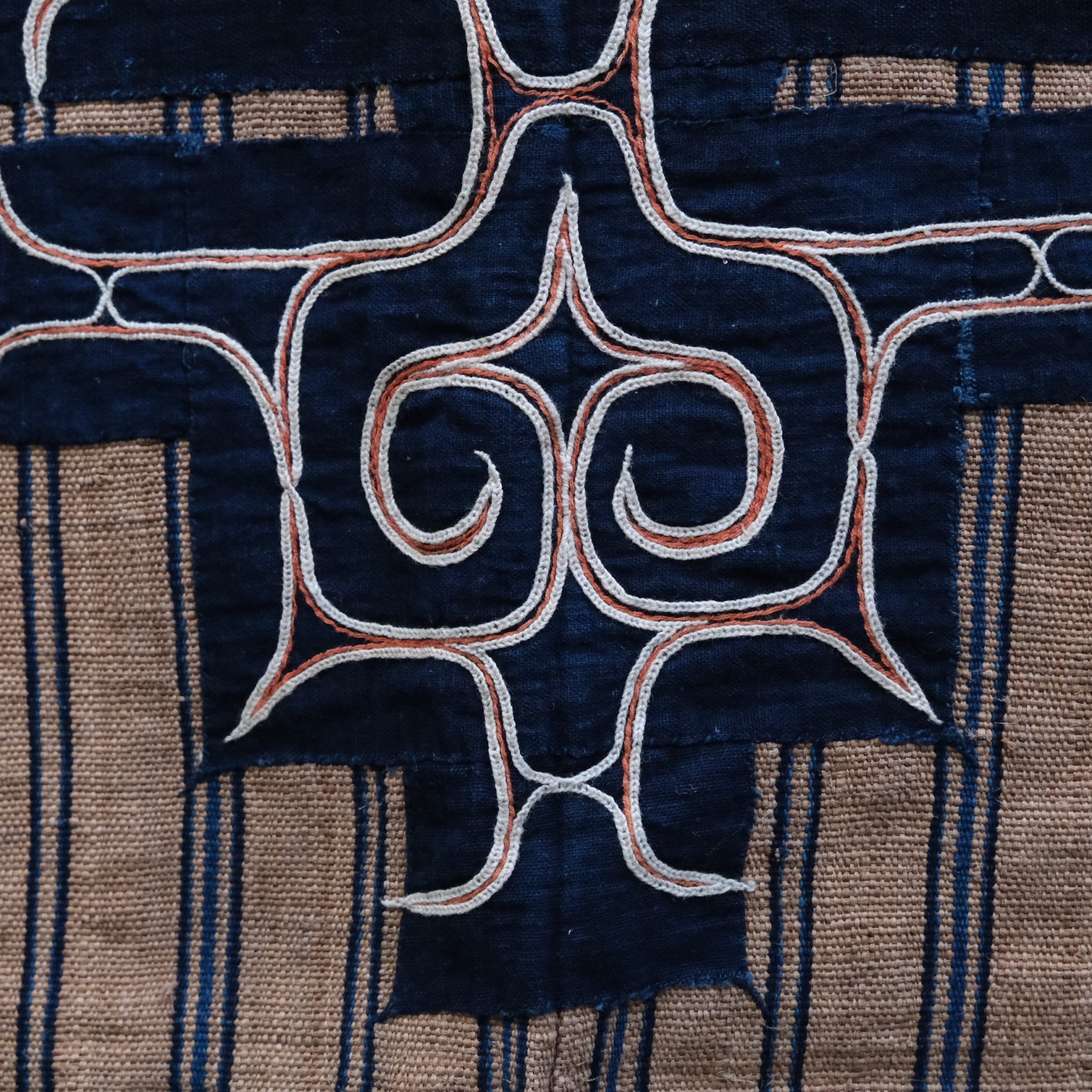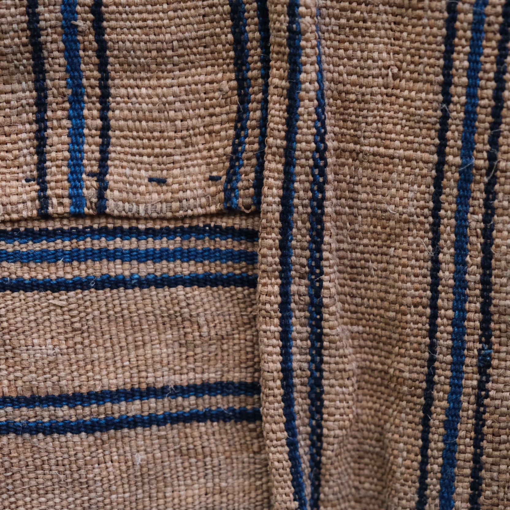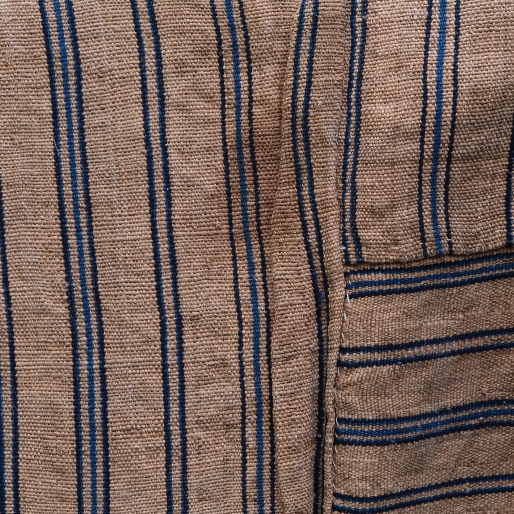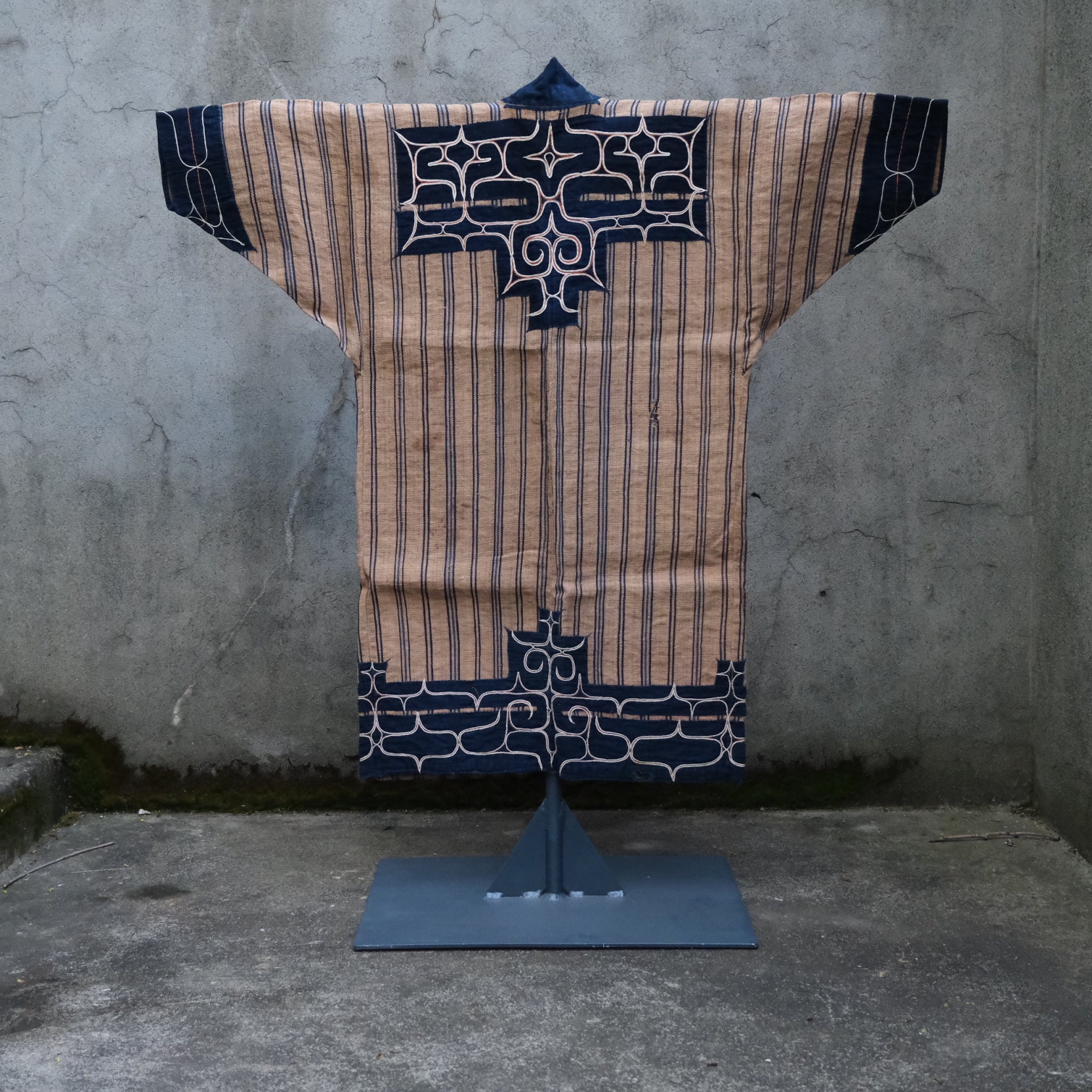 This fine example, from the early 20th century, features a striped attush base, iron-dyed cotton appliqué, and yellow embroidery stitching. The attush weaving is in good condition with no holes or stains. There is some wear to the appliqué, consistent with the garment’s age. The textile measures approximately 42”x42”. Given its size, it’s likely this was a woman’s robe.